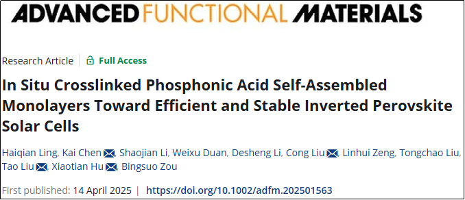 Meanwhile, the team has also made significant progress in material innovation. For the first time, the team designed and synthesized a novel hole transport material named V3PACz with in-situ crosslinking capability by combining an in-situ self-polymerization strategy with carbazole phosphonic acid self-assembled molecules. This breakthrough enabled the fabrication of quality Poly-V3PACz hole transport layers, achieving an outstanding power conversion efficiency of 25.21% along with excellent stability. This research holds important scientific significance and practical value for the further development of highly efficient and stable perovskite solar cells.
