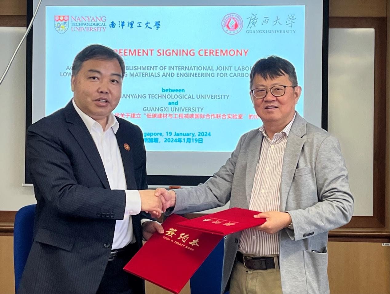 On behalf of Guangxi University, Xiao signed an agreement with representatives of the laboratory of Nanyang Technological University in Singapore on the establishment of the "Low-carbon Building Materials and Engineering Carbon Reduction International Cooperation Joint Laboratory" and visited the low-carbon building and smart classroom of NTU.