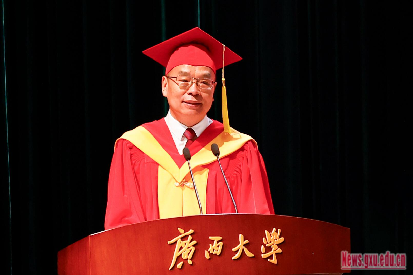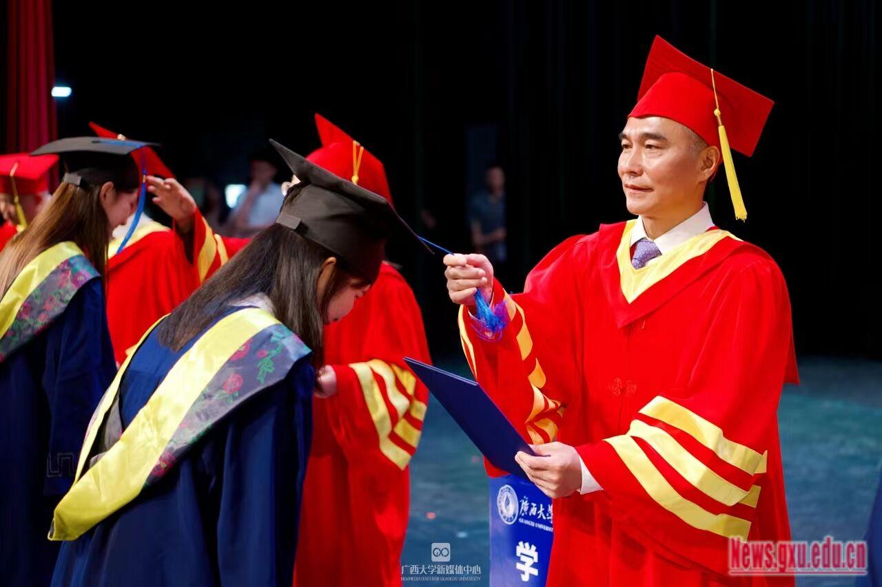 Wang Naixue, Vice Chairman of the Gunangxi Zhuang Autonomous Region CPPCC and Secretary of the CPC GXU Committee, conferred degrees to the graduates