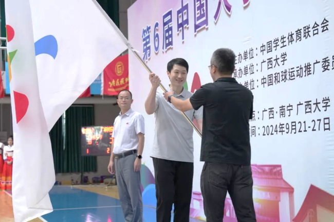 During the closing ceremony, the Chairperson of the Party Committee of GXU School of Physical Education returned the flag to Teng Chong, Vice Chairman and Secretary-General of the China Uniball Sports Promotion Committee. Furthermore, Teng Chong delivered the flag to the intended organizer of the "7th China Uniball Tournament for College Students ".