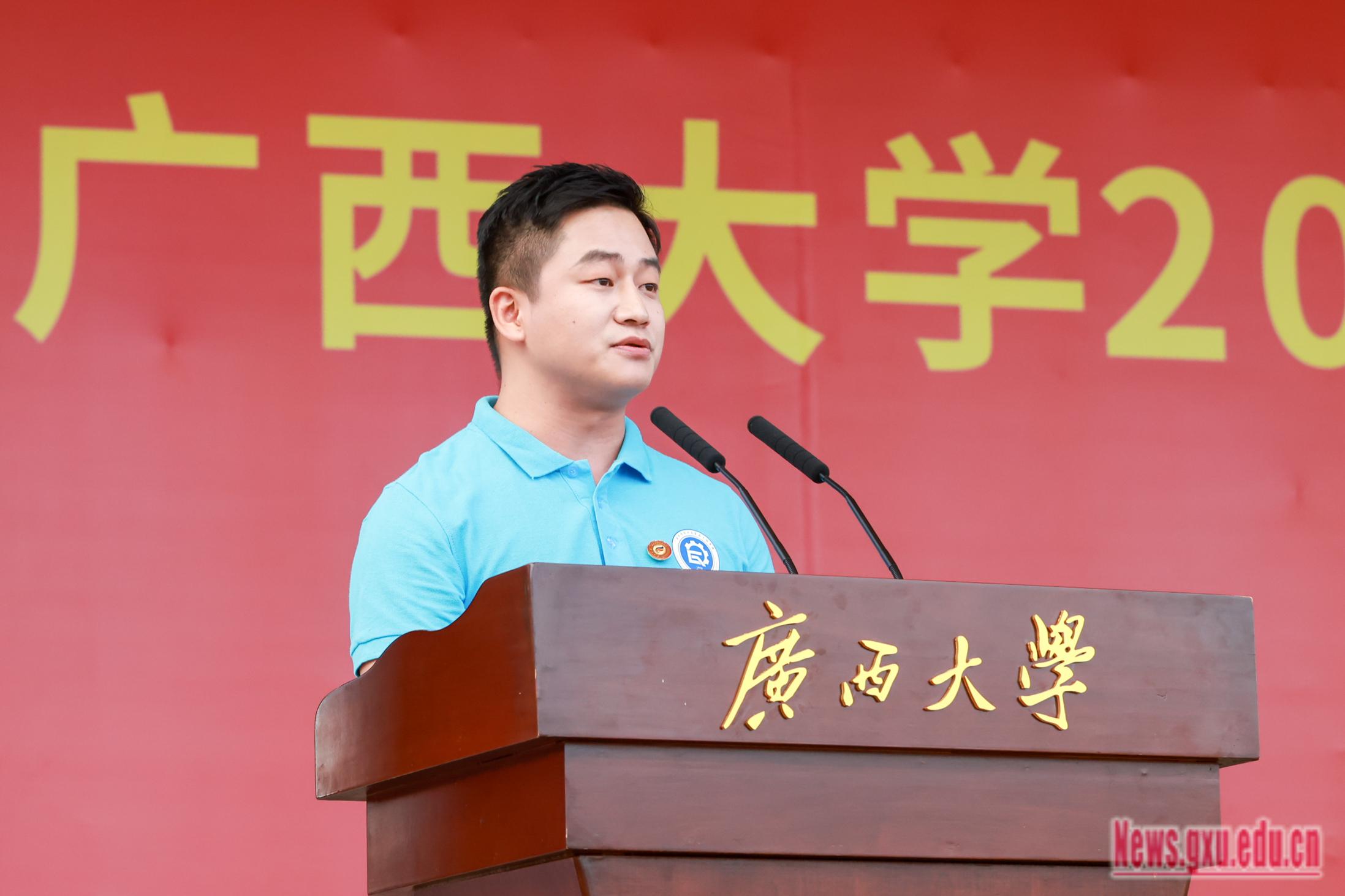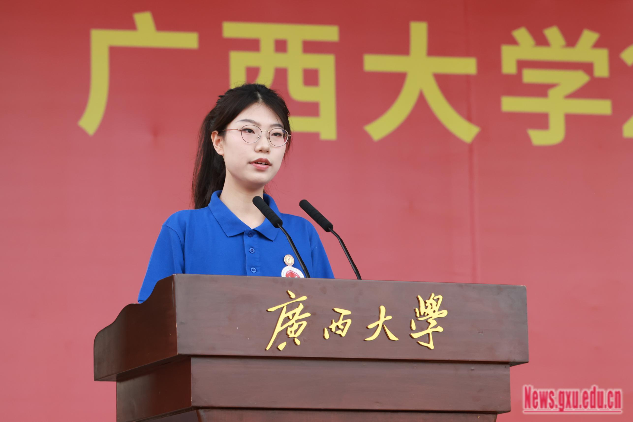 Wei Xinshuo, seorang pelajar sarjana muda yang mengambil jurusan Kewangan di Sekolah Ekonomi China-ASEAN, dan Liu Tao, seorang calon Ph.D. dalam Teknologi Industri Ringan dan Kejuruteraan di Sekolah Industri Ringan dan Kejuruteraan Makanan, menyampaikan ucapan sebagai wakil mahasiswa baharu dan semasa, masing-masing. Wei berkongsi perjalanannya untuk datang ke Universiti Guangxi, berjanji untuk menegakkan moto "ketekunan, kesungguhan, kesederhanaan, dan keikhlasan", menerima etos "Tiga-Semangat" dan menyepadukan aspirasi peribadi ke dalam naratif universiti dan pembangunan negara yang lebih luas. Beliau melahirkan keazamannya untuk berusaha dengan penuh semangat dan menjadi bakat generasi baharu dengan visi global, daya saing, dan kesetiaan yang mendalam kepada negara. Liu Tao menggunakan metafora "sekeping kertas" untuk menceritakan pertumbuhannya daripada "helaian kosong" kepada "kertas khusus," merenungkan pengalaman akademik, penyelidikan, dan praktikalnya sepanjang dekad yang lalu di universiti. Beliau menggalakkan mahasiswa baharu untuk menghargai masa mereka dan mengejar impian mereka dengan usaha yang tidak henti-hentinya, menulis bab baharu mereka sendiri di universiti.