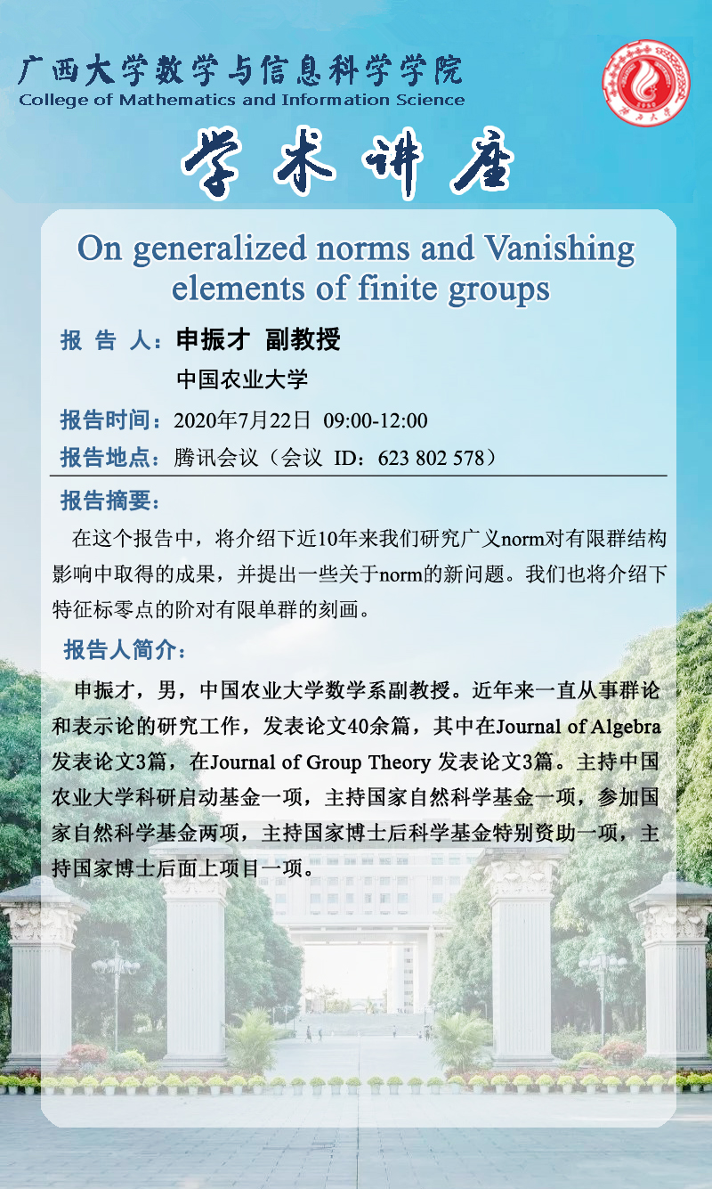 数信学院学术报告:On generalized norms and Vanishing elements of finite groups