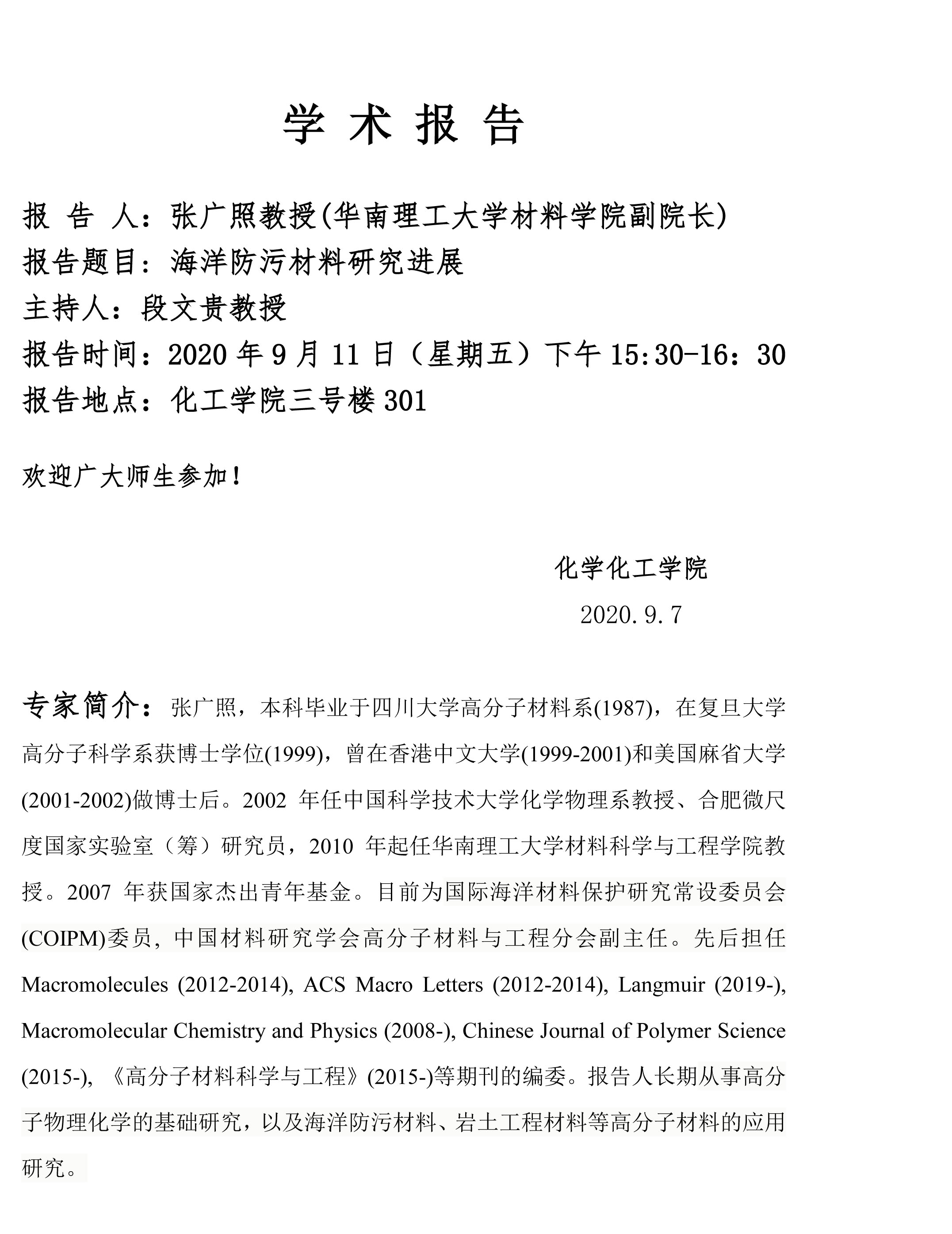 化学化工学院学术报告:海洋防污材料研究进展