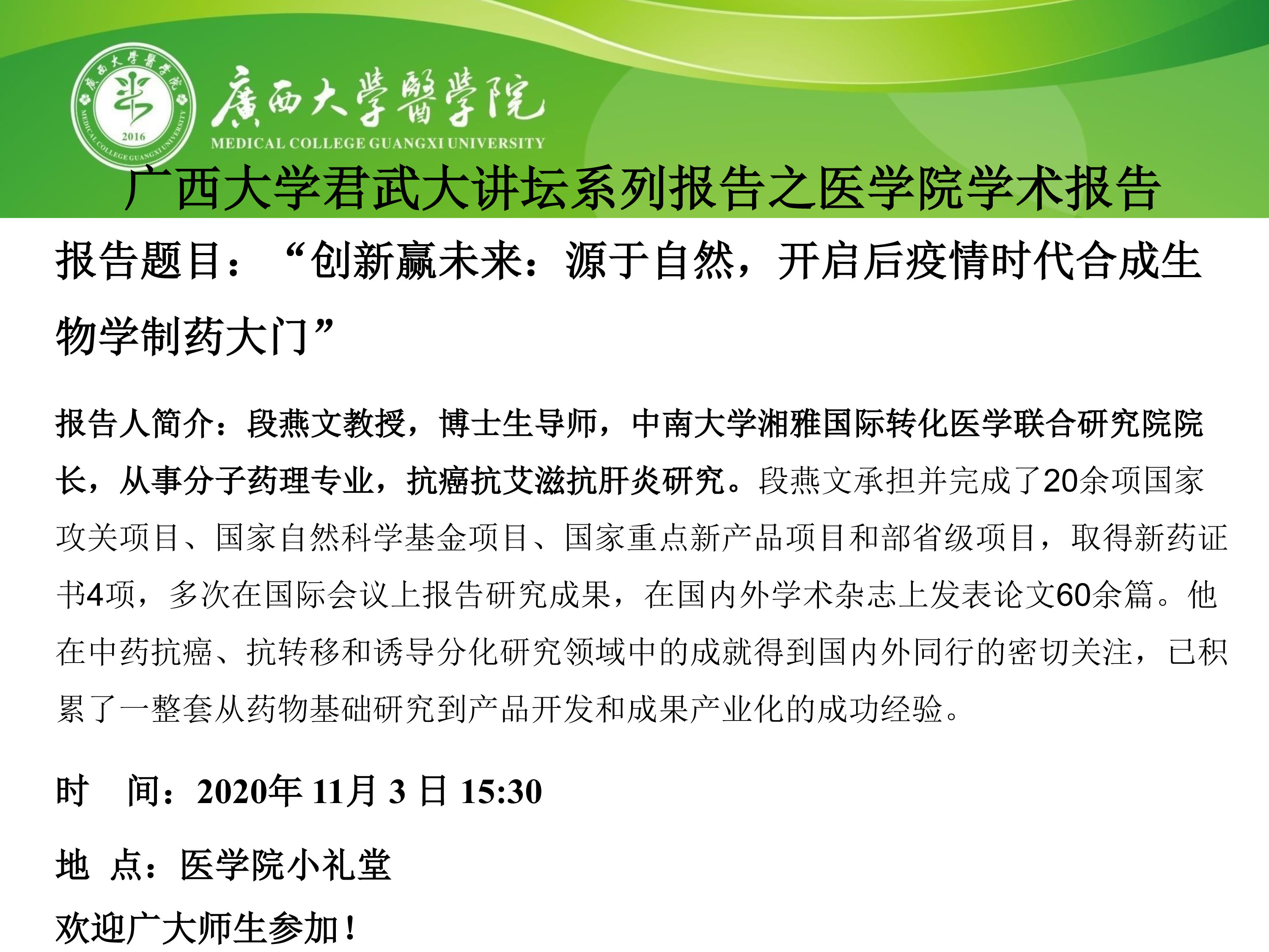 best365足球官网君武大讲坛系列报告之医学院学术报告:“创新赢未来:源于自然,开启后疫情时代合成生物学制药大门”