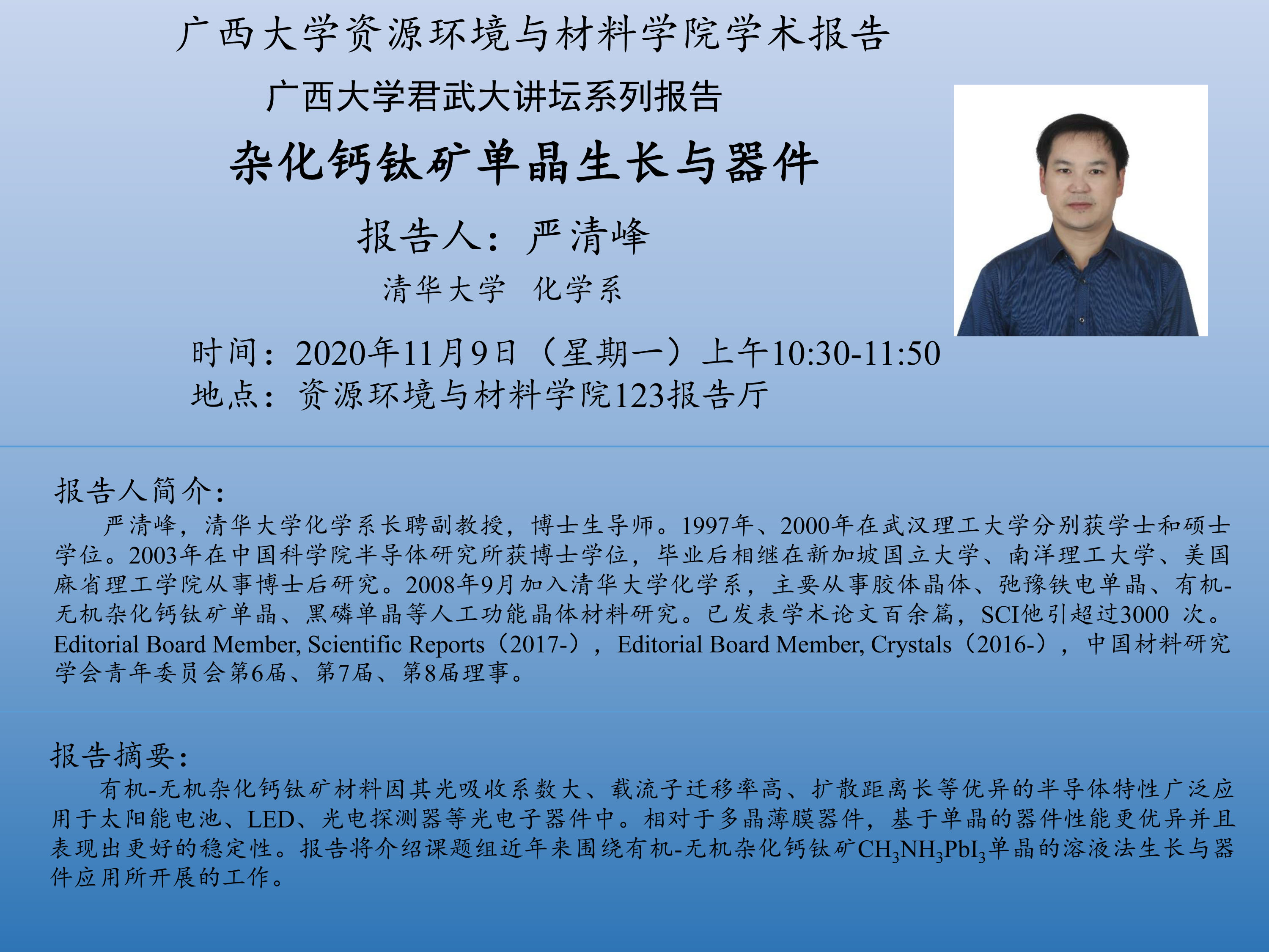 资源环境与材料学院学术报告:“best365足球官网君武大讲坛系列”杂化钙钛矿单晶生长与器件
