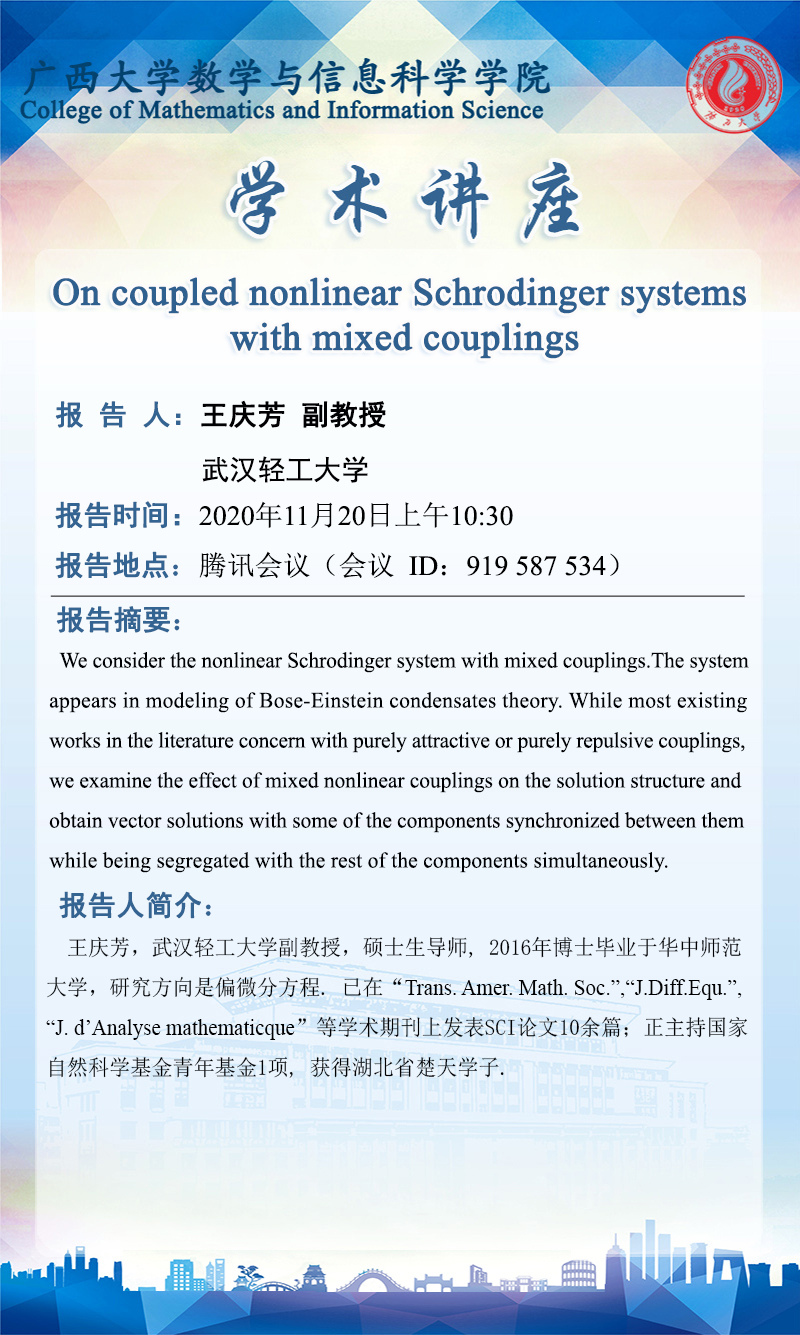 数学与信息科学学院学术讲座:On coupled nonlinear Schrodinger systems with mixed couplings