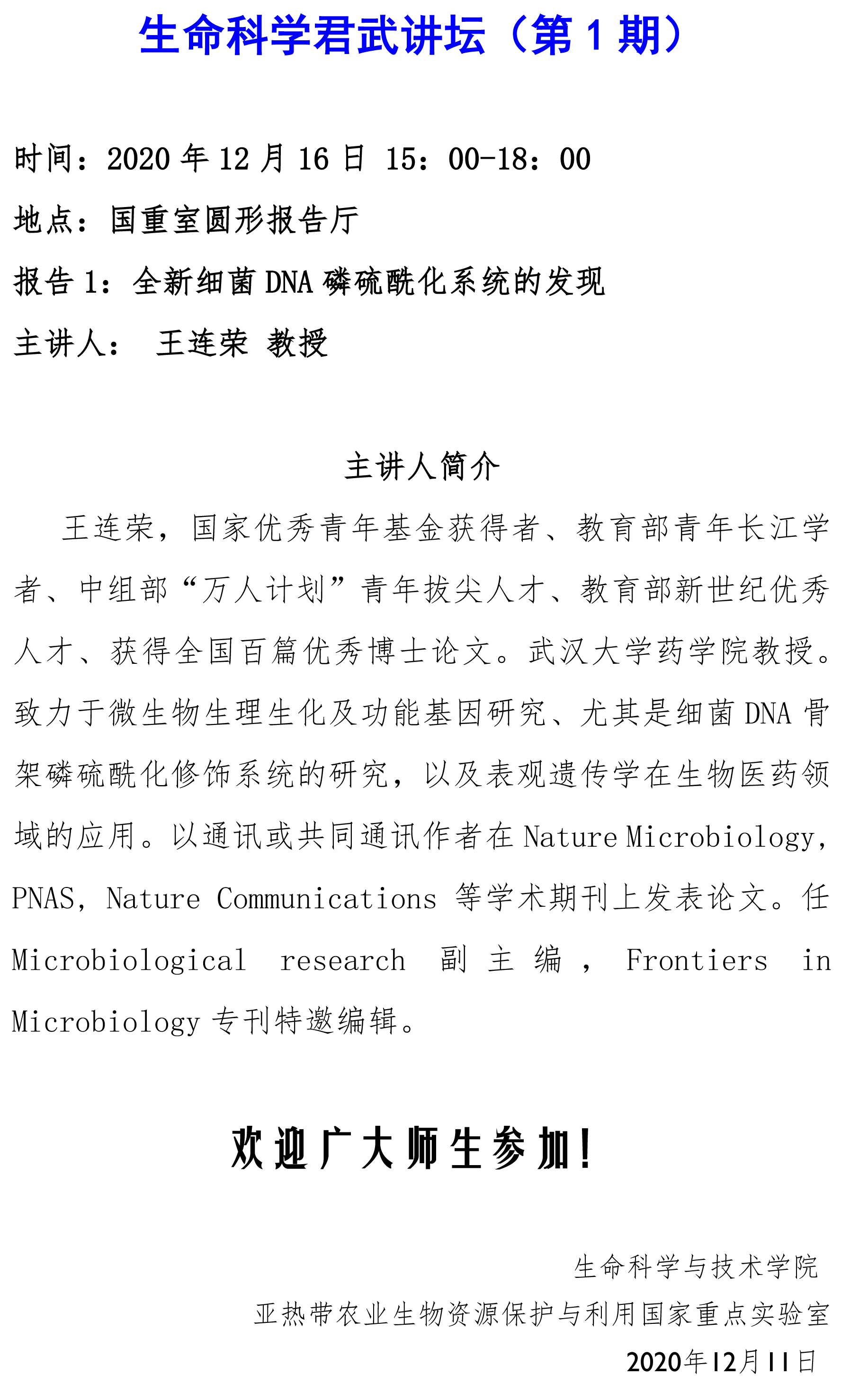 生命科学君武讲坛(第1期):全新细菌DNA磷硫酰化系统的发现;铜绿假单胞菌一个新的信号转换系统控制生物膜的形成