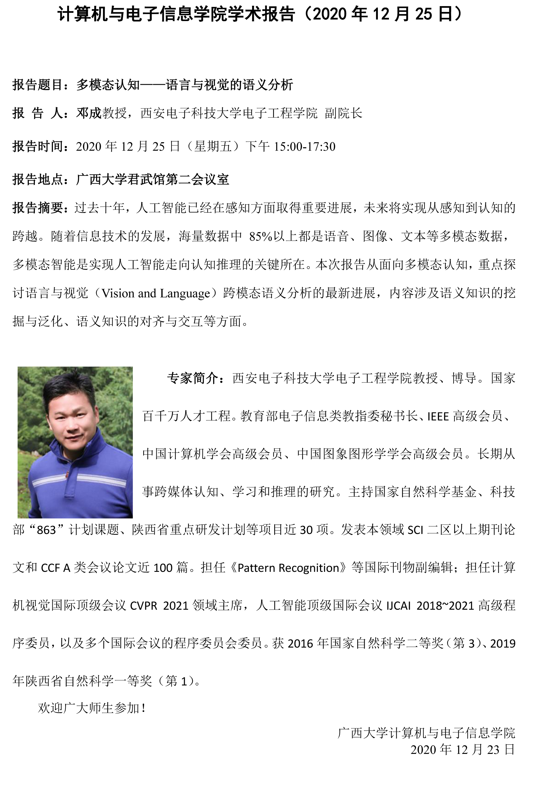 下一条:计算机与电子信息学院学术报告:砺剑图强,勇于创新--从当研究生到指导研究生谈几点体会