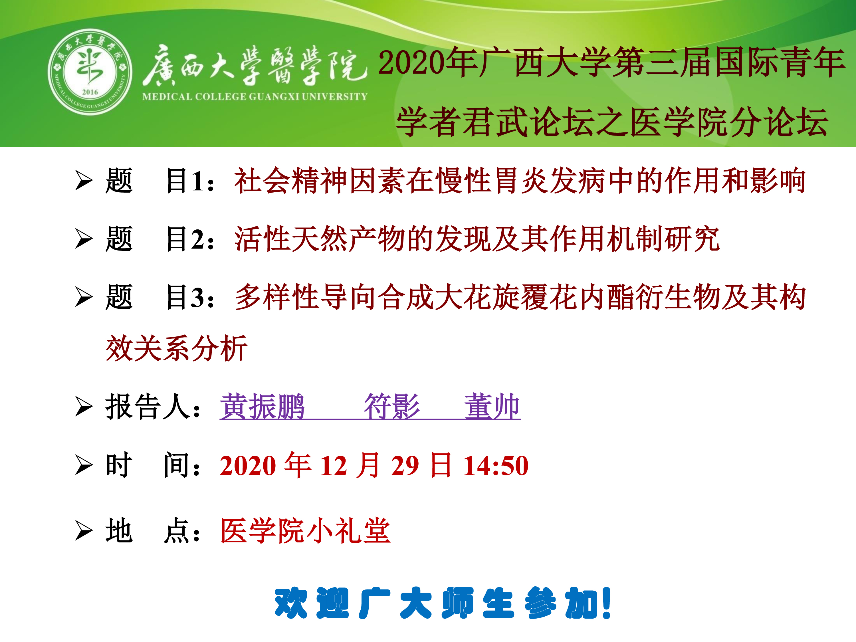 2020年best365足球官网第三届国际青年学者君武论坛之医学院分论坛:社会精神因素在慢性胃炎发病中的作用和影响;活性天然产物的发现及其作用机制研究;多样性导向合成大花旋覆花内酯衍生物及其构效关系分析;
