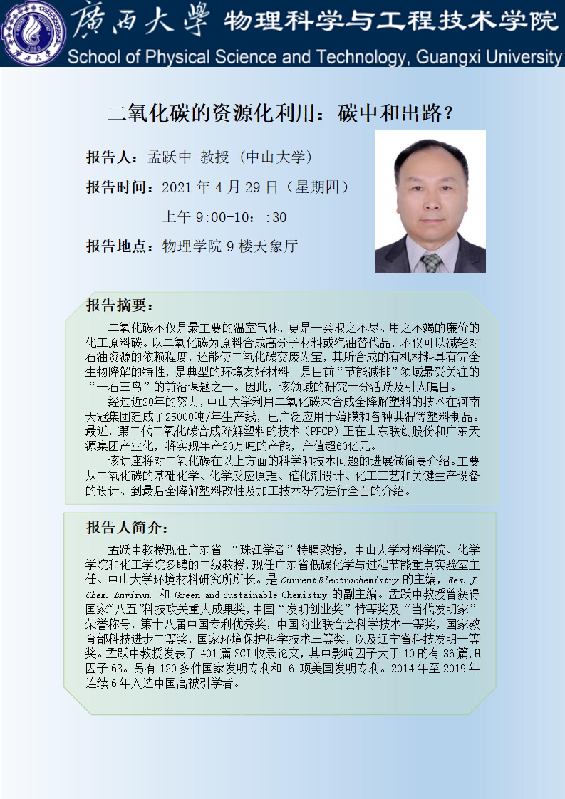 物理科学与工程技术学院学术报告:二氧化碳的资源化利用:碳中和出路?