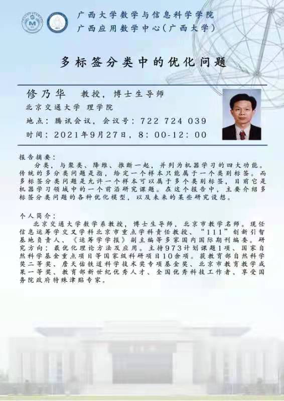 主讲人 修乃华 教授 地址 腾讯会议 会议号:722 724 039