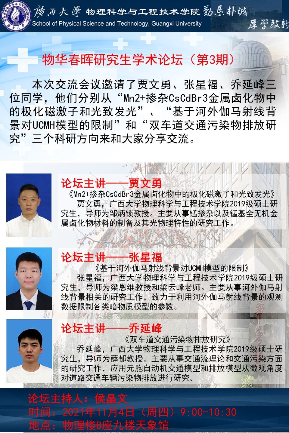 物理学院物华春晖学术论坛(第三期):Mn2+掺杂CsCdBr3金属卤化物中的极化磁激子和光致发光;基于河外伽马射线背景对UCMH模型的限制;双车道交通污染物排放研究