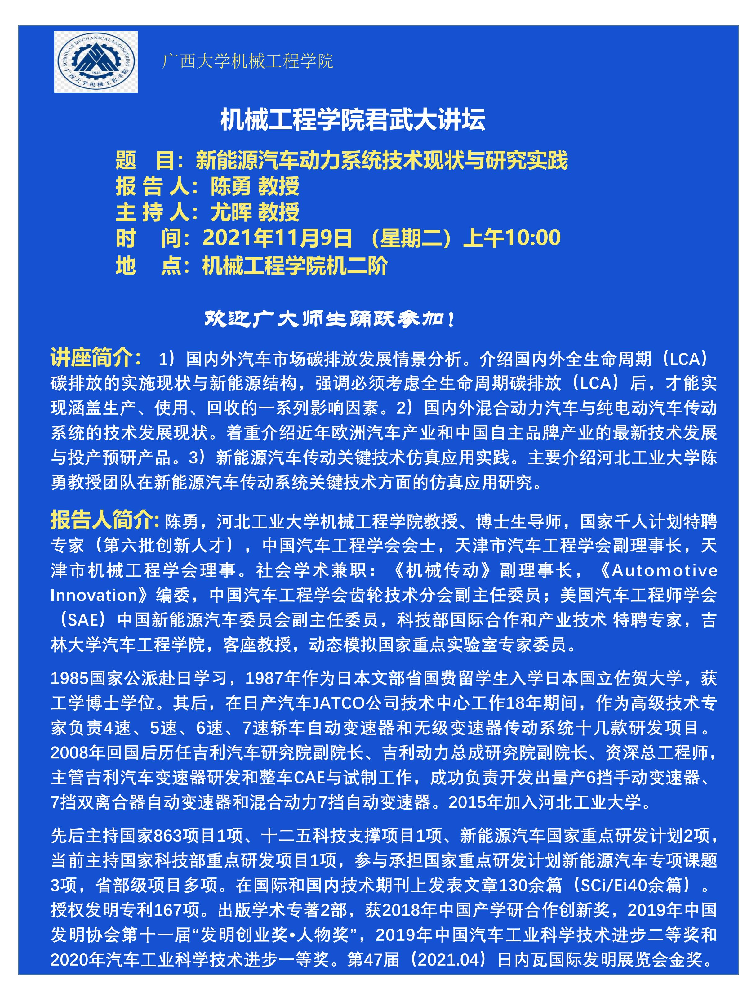 机械工程学院君武大讲坛:新能源汽车动力系统技术现状与研究实践