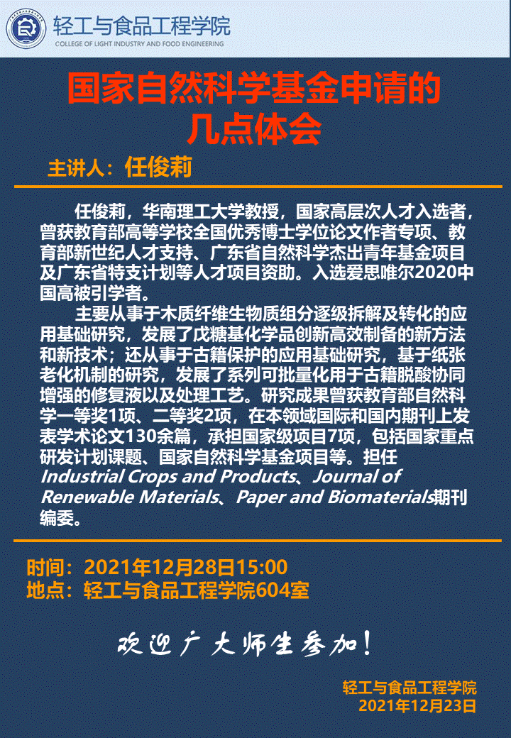 轻工与食品工程学院学术报告:国家自然科学基金申请的几点体会