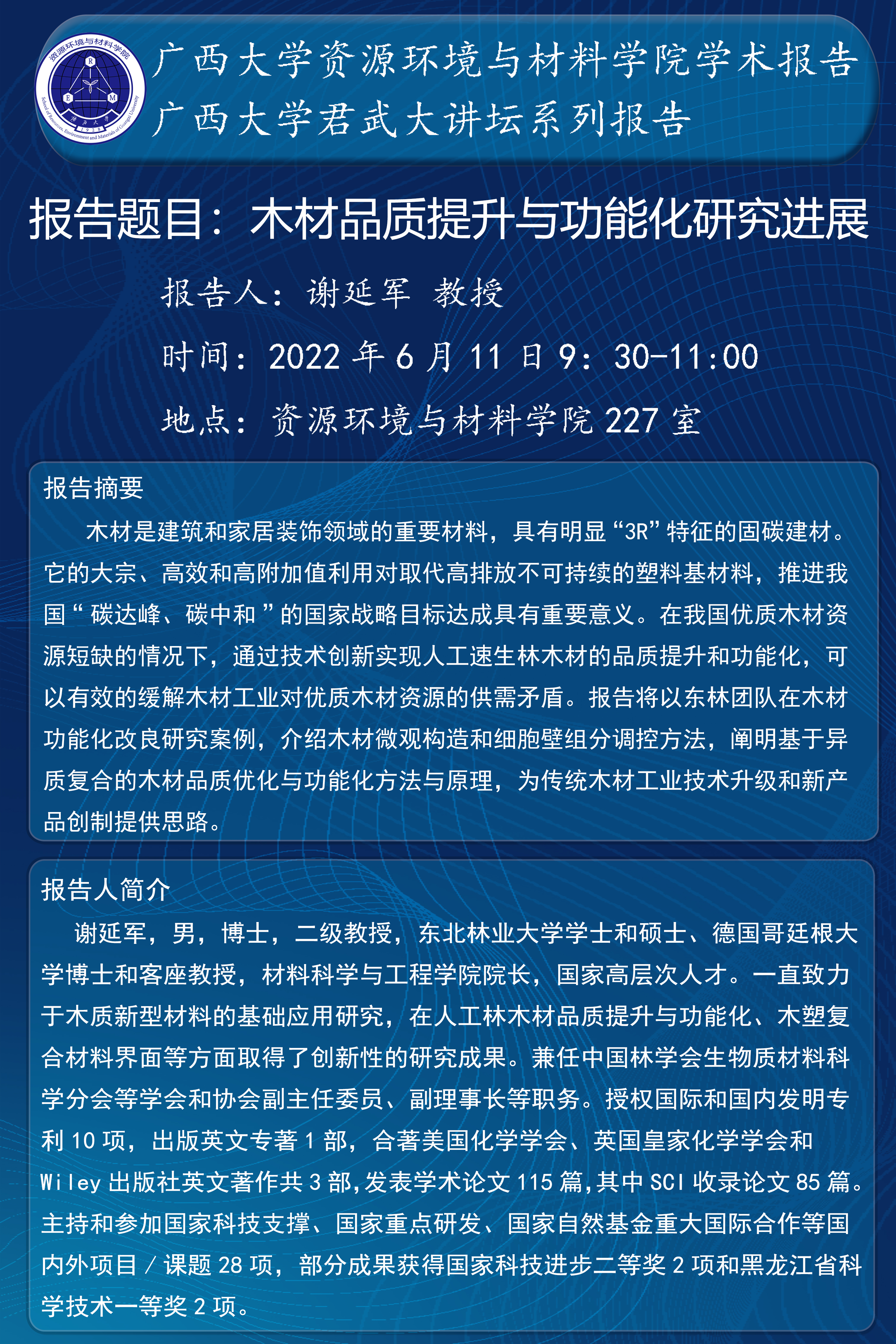 资源材料与环境学院学术报告:木材品质提升与功能化研究进展