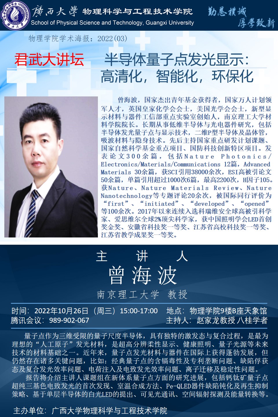 君武大讲坛物理科学与工程技术学院学术报告 半导体量子点发光显示:高清化,智能化,环保化