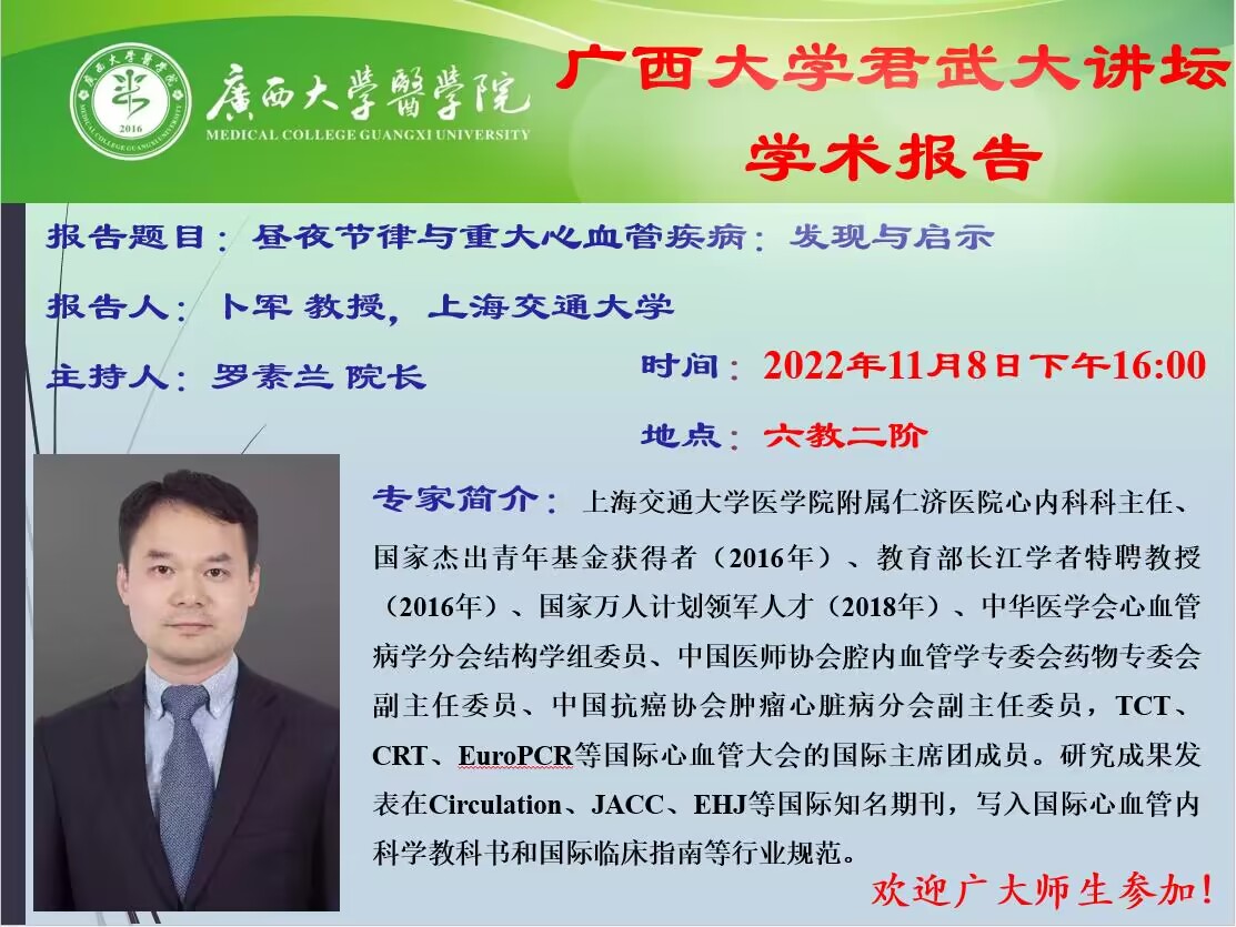 君武大讲坛医学院学术报告 昼夜节律与重大心血管疾病:发现与启示