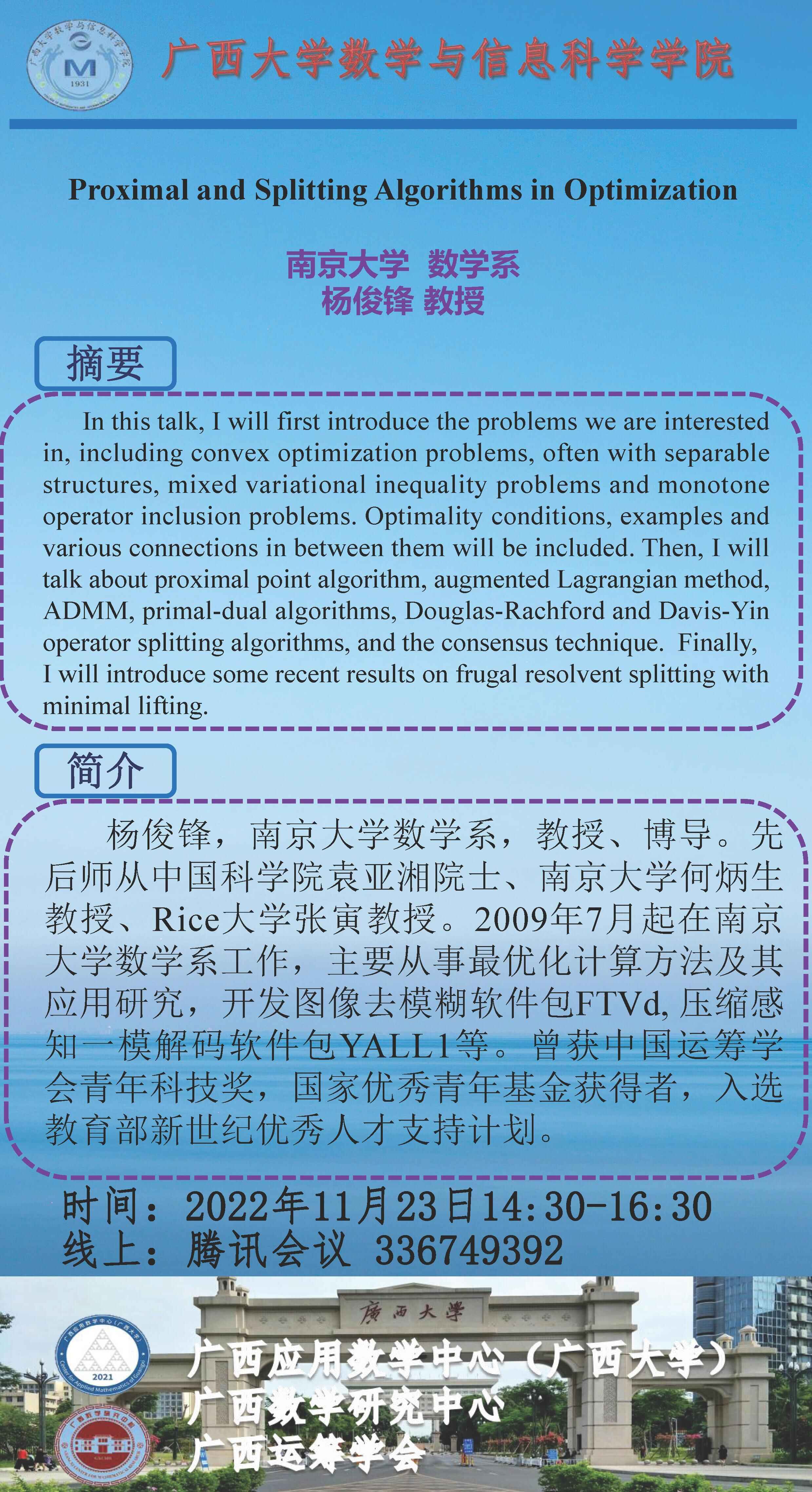 数学与信息科学学院/广西应用数学中心(best365足球官网)学术报告Proximal and Splitting Algorithms in Optimization