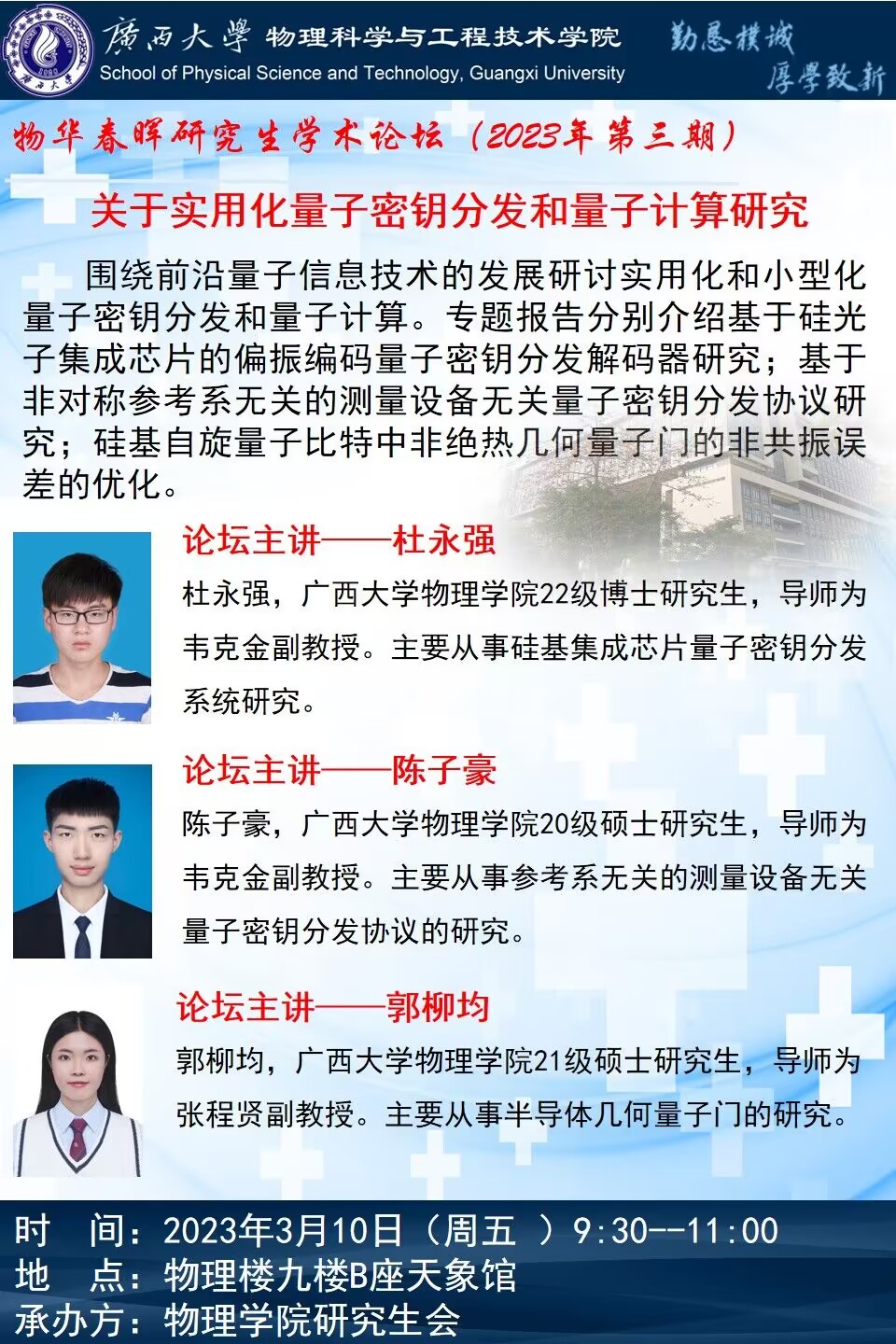 物理学院2023年物华春晖学术论坛(第三期):关于实用化量子密钥分发和量子计算研究