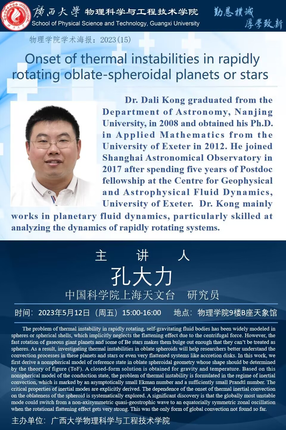 物理学院2023年学术报告系列之15:Onset of thermal instabilities in rapidly rotating oblate-spheroidal planets or stars