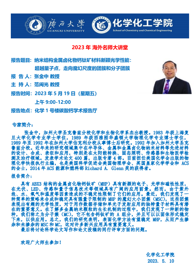 化学化工学院2023年海外名师大讲堂:纳米结构金属卤化物钙钛矿材料新颖光学性能: 超越量子点,走向魔幻尺度的团簇和分子团簇