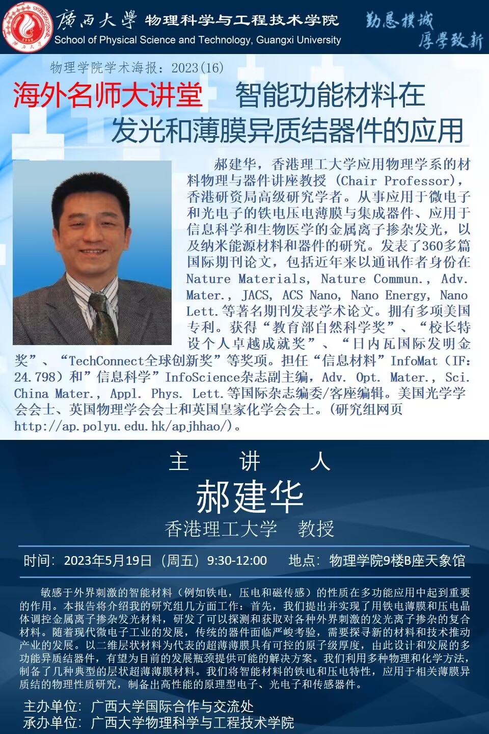 物理学院2023年学术报告系列之16:智能功能材料在发光和薄膜异质结器件的应用