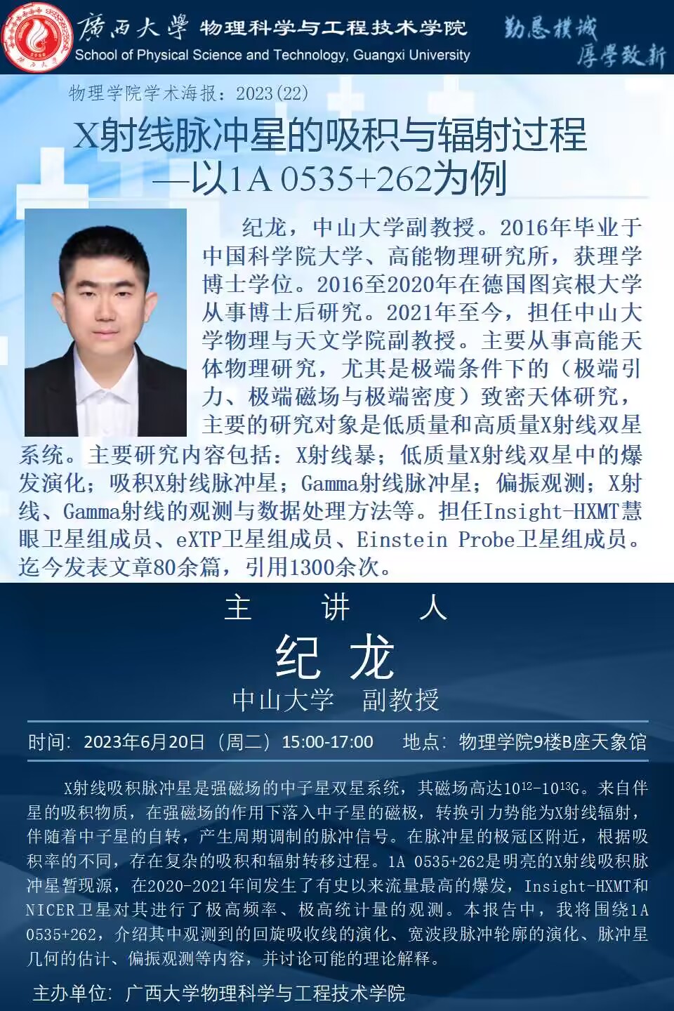 物理学院2023年学术报告系列之22:X射线脉冲星的吸积与辐射过程—以1A 0535+262为例