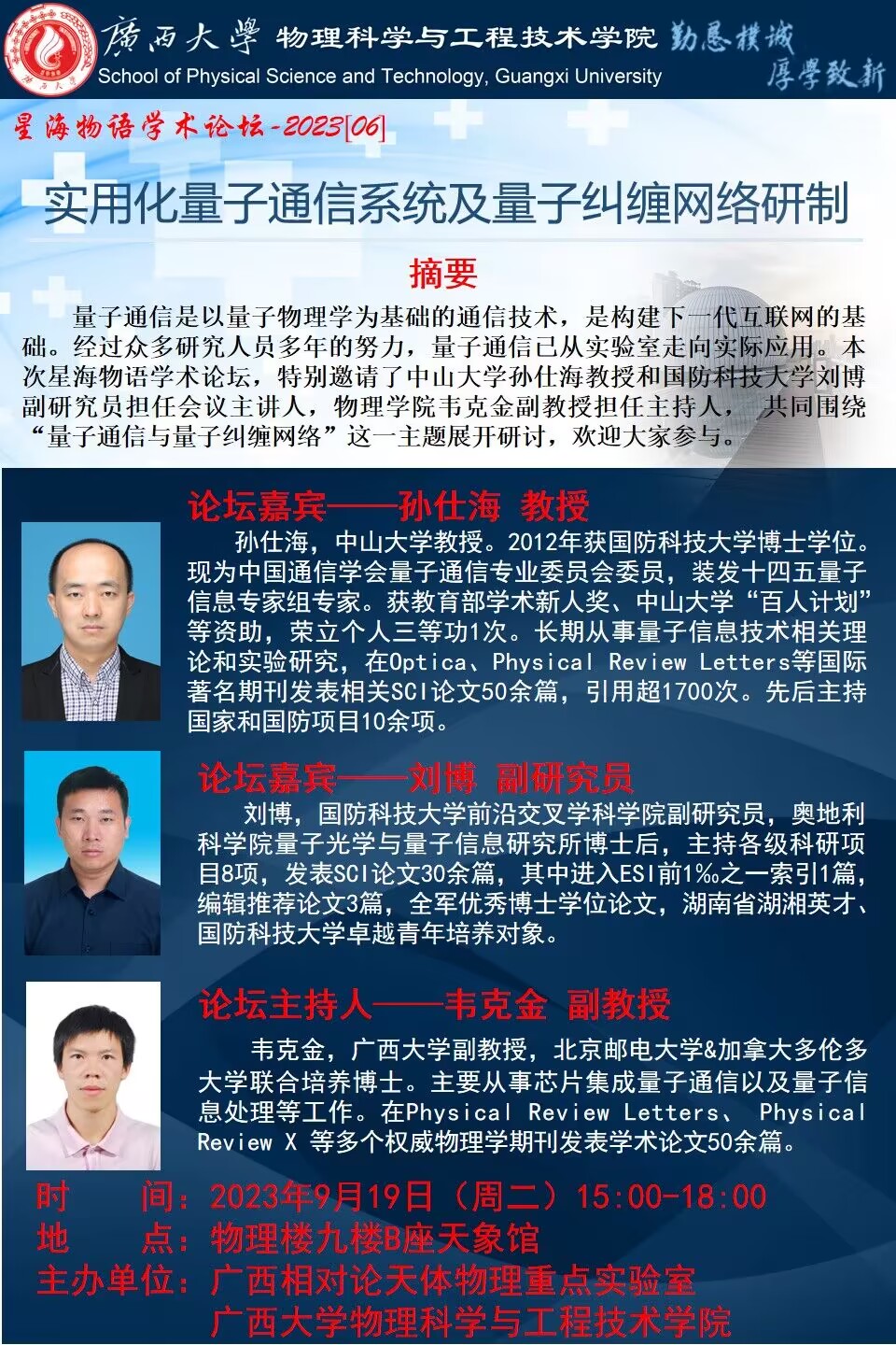 物理学院2023年星海物语学术论坛(第六期):实用化量子通信系统及量子纠缠网络研制