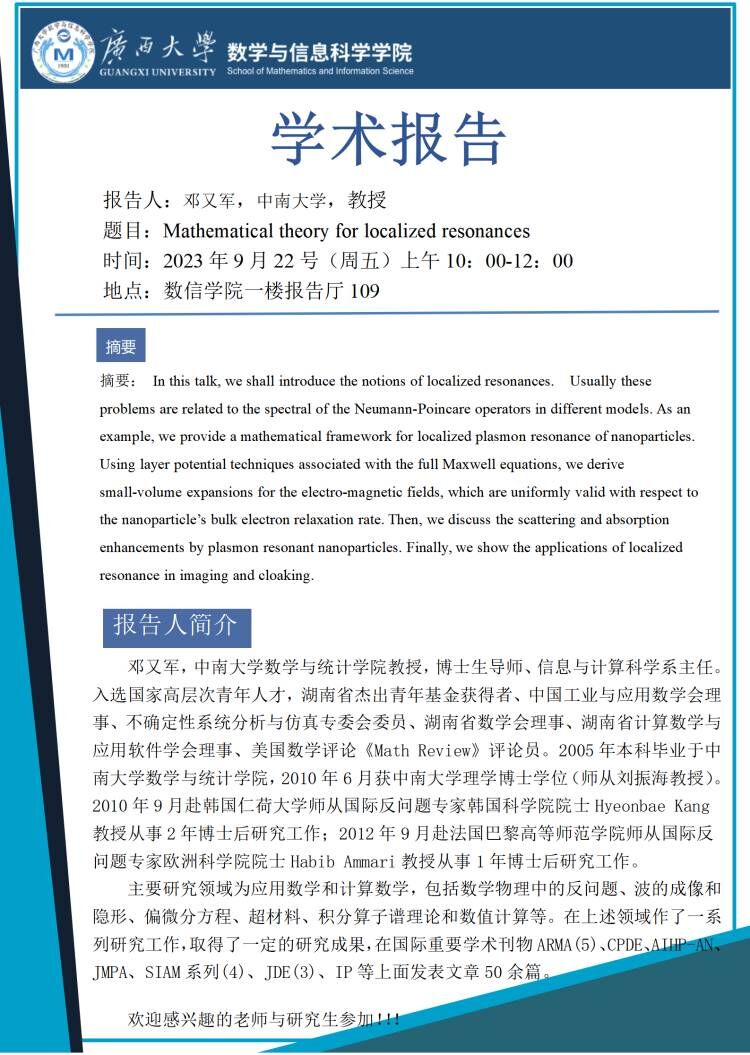 数学与信息科学学院学术报告:Mathematical theory for localized resonances