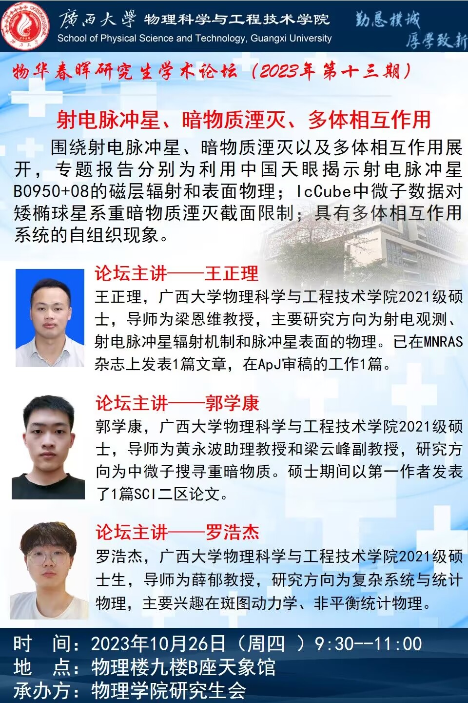 物理学院2023年物华春晖学术论坛(第十三期):射电脉冲星、暗物质湮灭、多体相互作用
