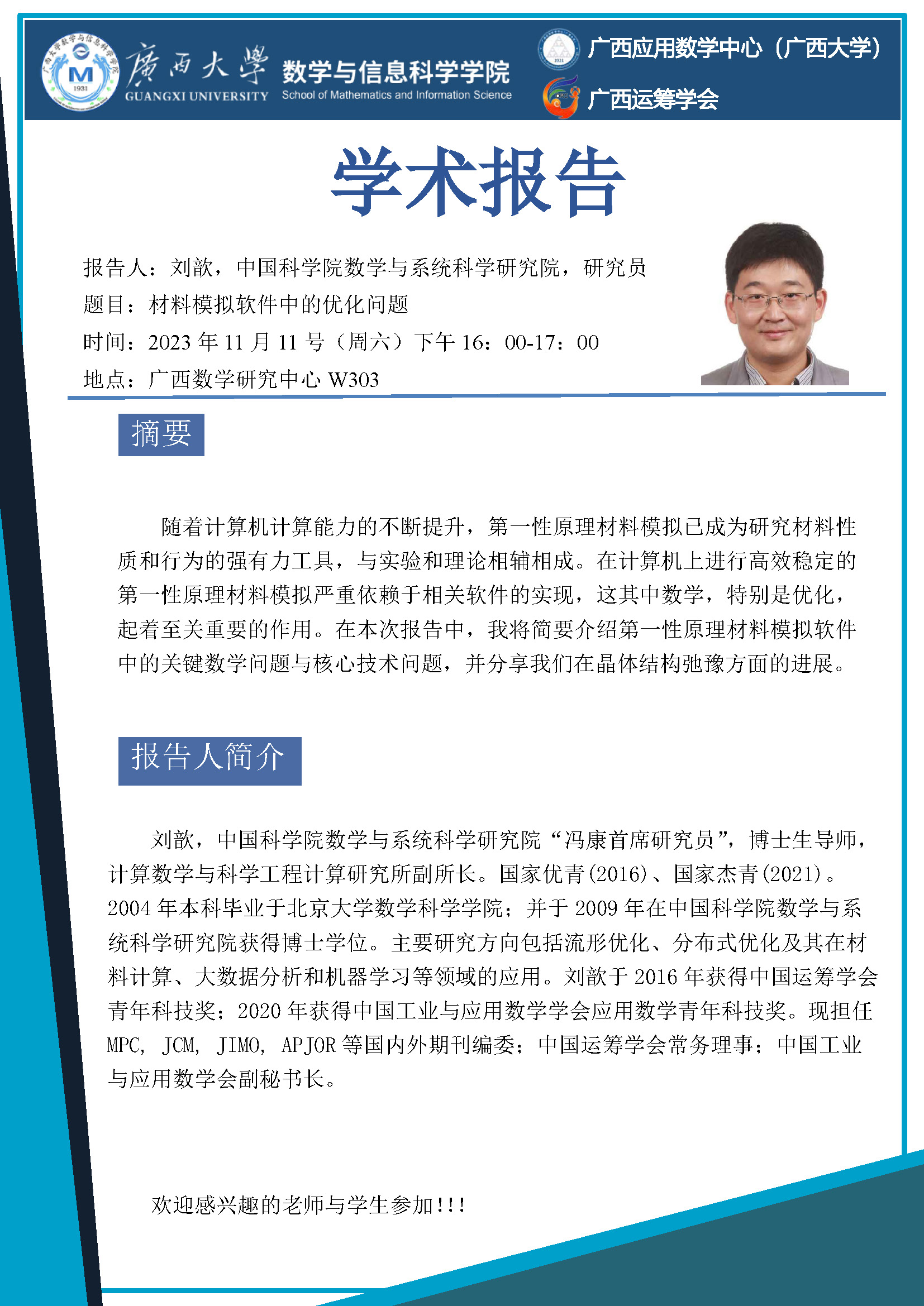 主讲人 刘歆,中国科学院数学与系统科学研究院,研究员 地址 广西数学研究中心 W303