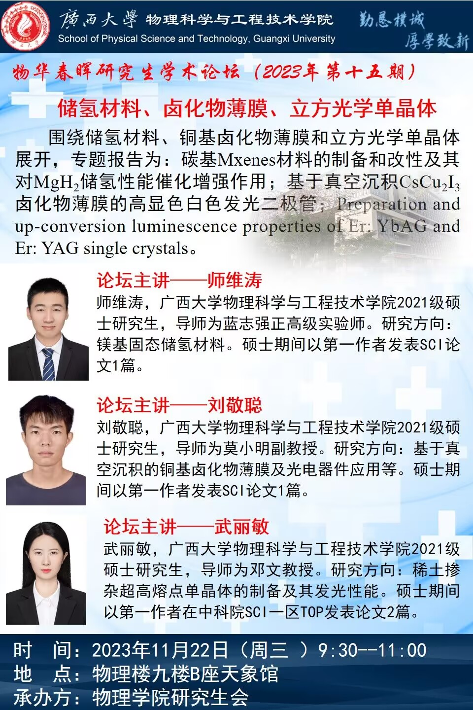 物理学院2023年物华春晖学术论坛(第十五期):储氢材料、卤化物薄膜、立方光学单晶体