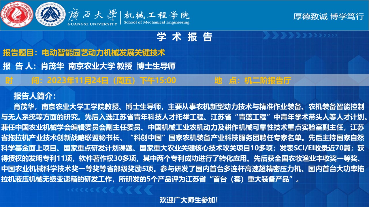 机械工程学院学术报告:电动智能园艺动力机械发展关键技术