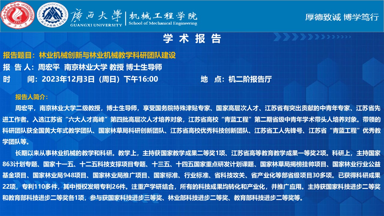 机械工程学院学术报告:林业机械创新与林业机械教学科研团队建设