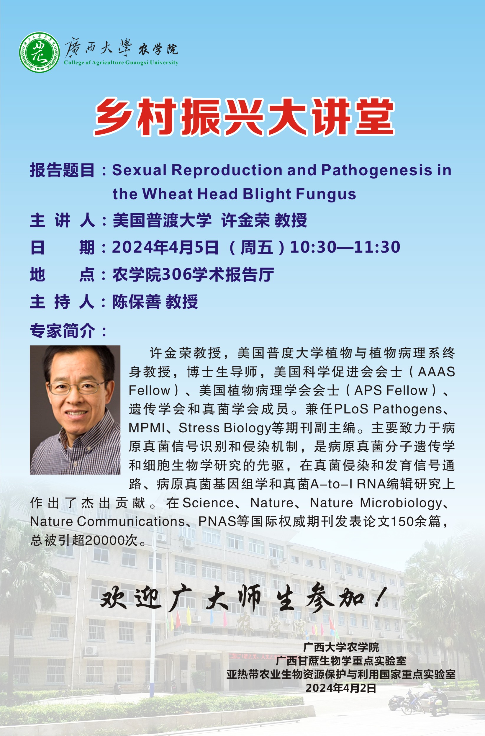 乡村振兴大讲堂:Sexual Reproduction and Pathogenesis in the Wheat Head Blight Fungus
