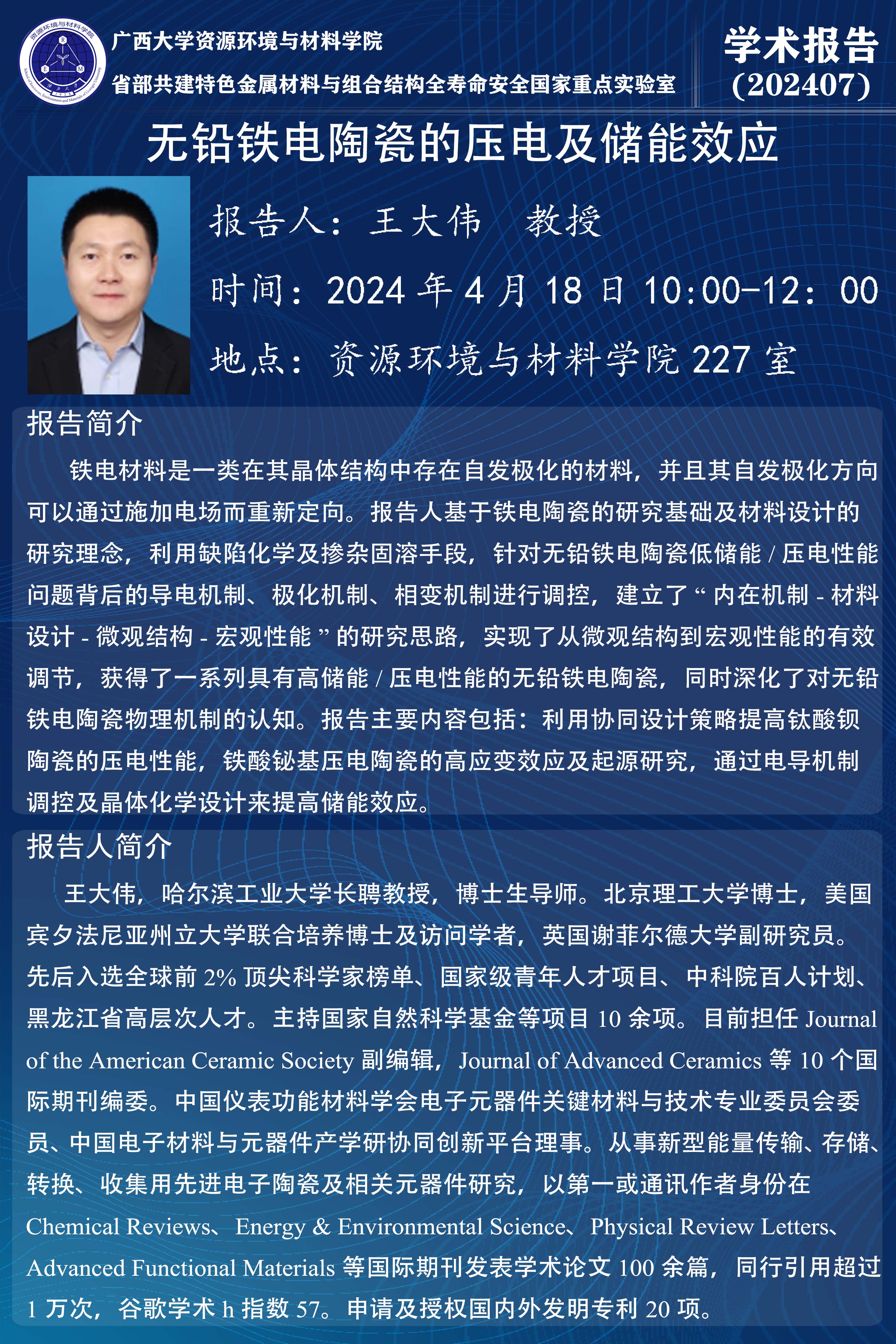 资源环境与材料学院学术报告:无铅铁电陶瓷的压电及储能效应