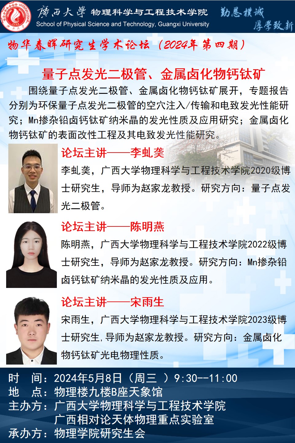 物理学院2024年物华春晖学术论坛(第四期):量子点发光二极管、金属卤化物钙钛矿