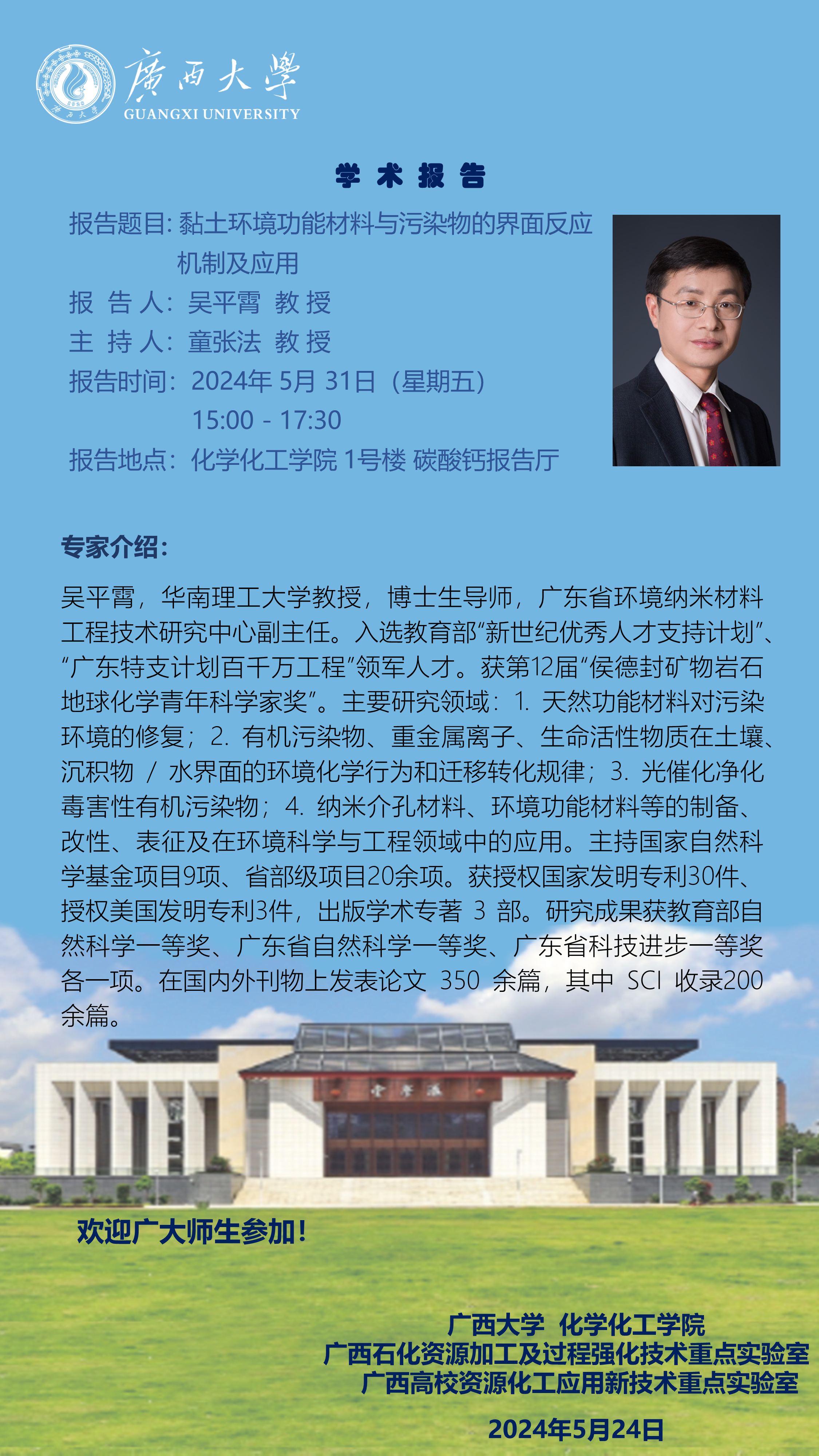 化学化工学院学术报告:黏土环境功能材料与污染物的界面反应机制及应用
