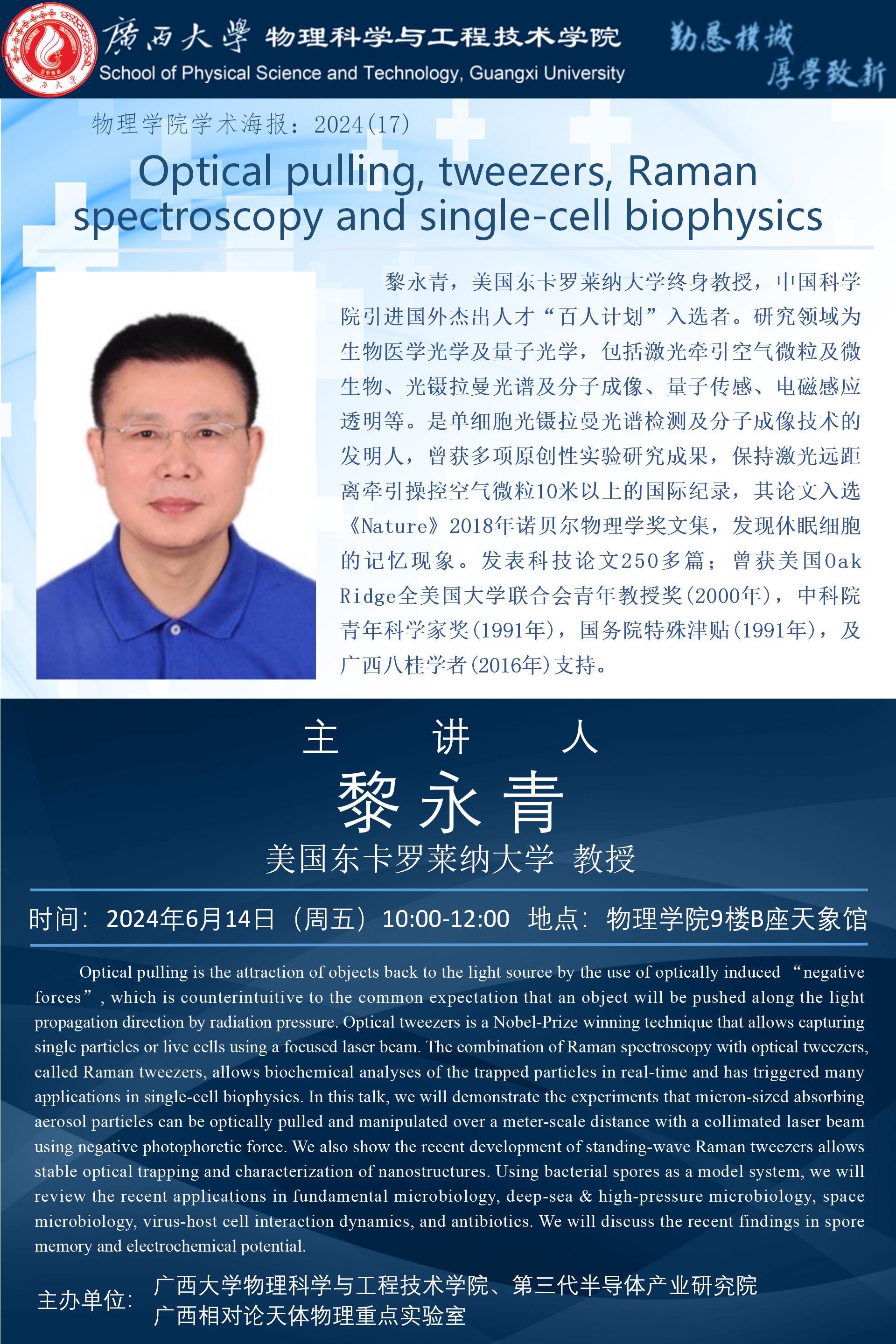 物理学院2024年学术报告之17:Optical pulling, tweezers, Raman spectroscopy and single-cell biophysics