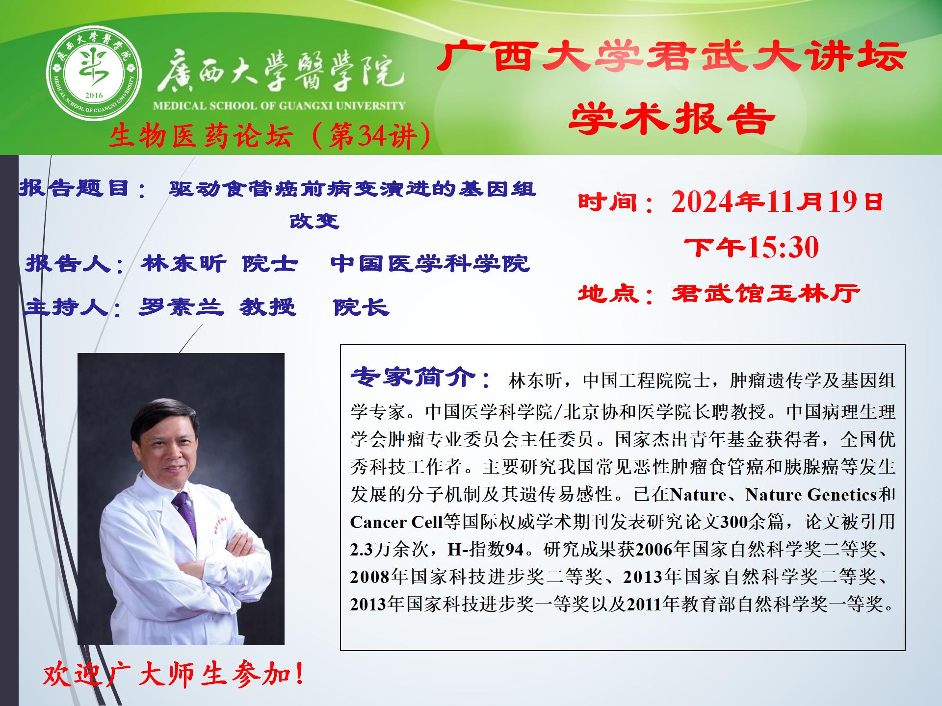 君武大讲坛、医学院学术报告:驱动食管癌前病变演进的基因组改变