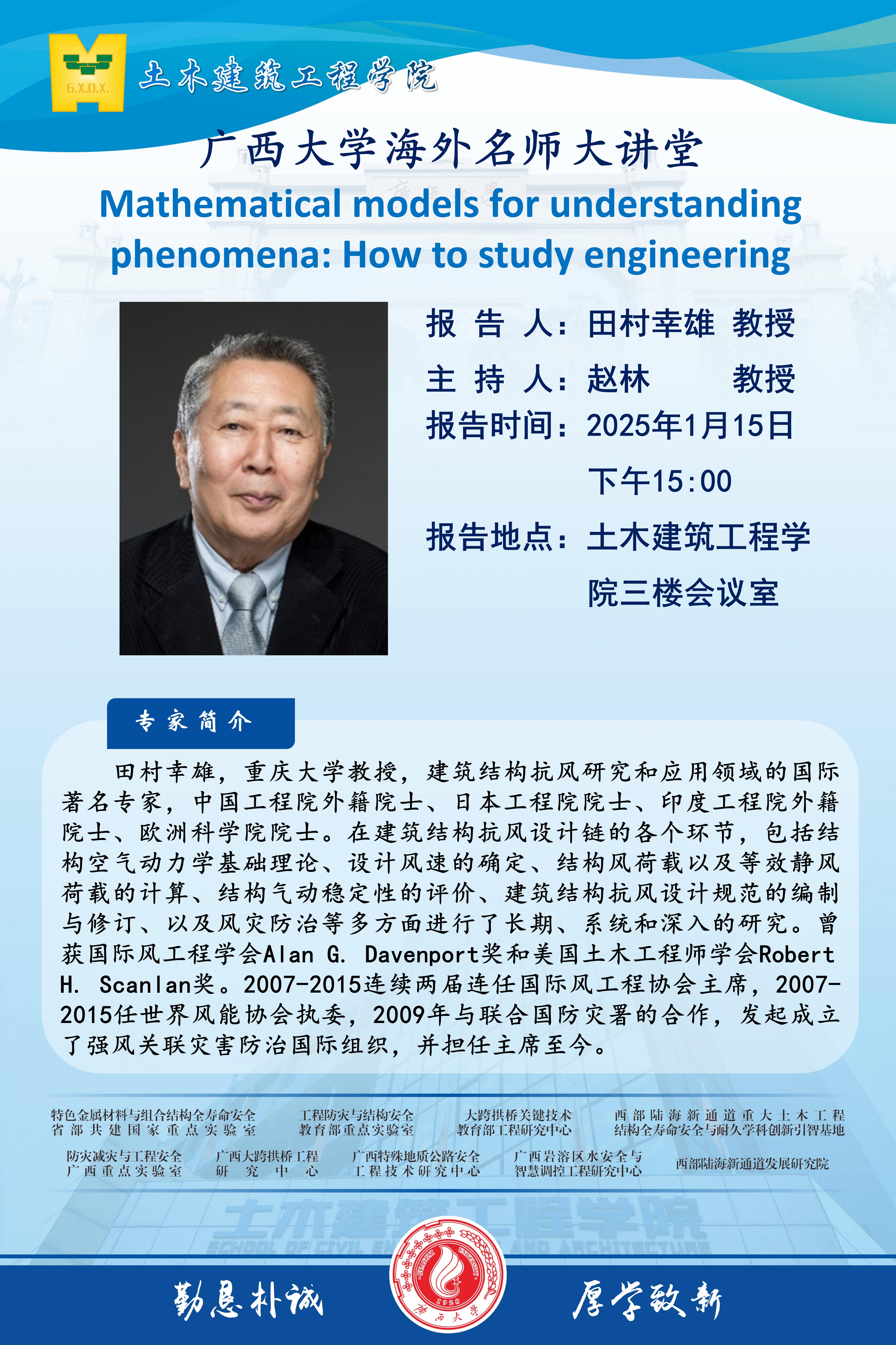 海外名师大讲堂、土木建筑工程学院学术报告:Mathematical models for understanding phenomena: How to study engineering