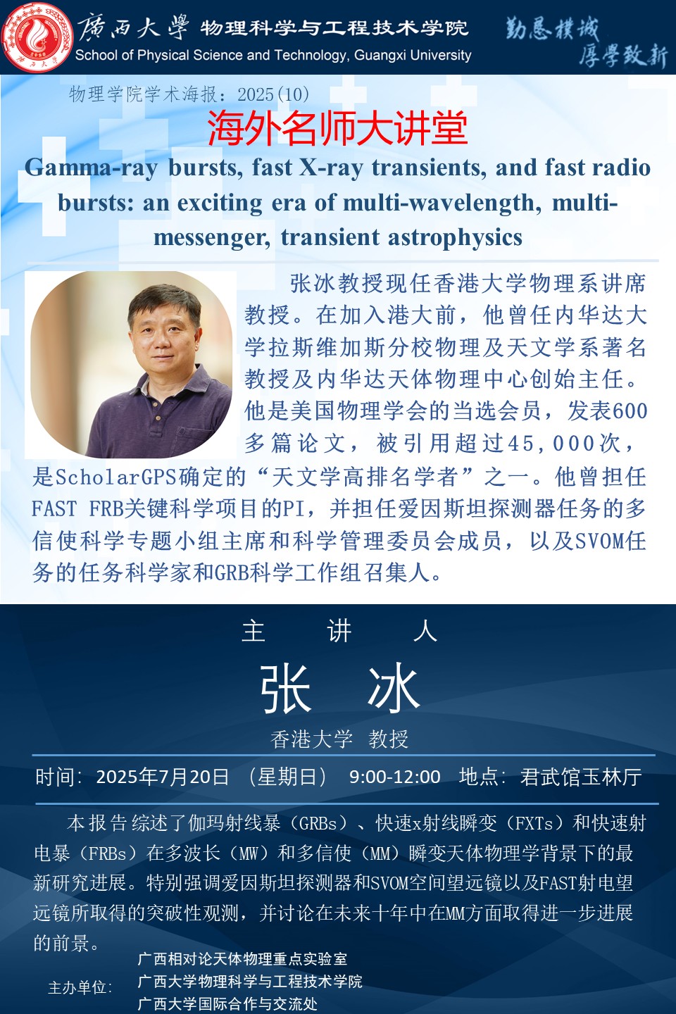 海外名师大讲堂、物理科学与工程技术学院学术报告:Gamma-ray bursts, fast X-ray transients, and fast radio bursts: an exciting era of multi-wavelength, multi-messenger, transient astrophysics