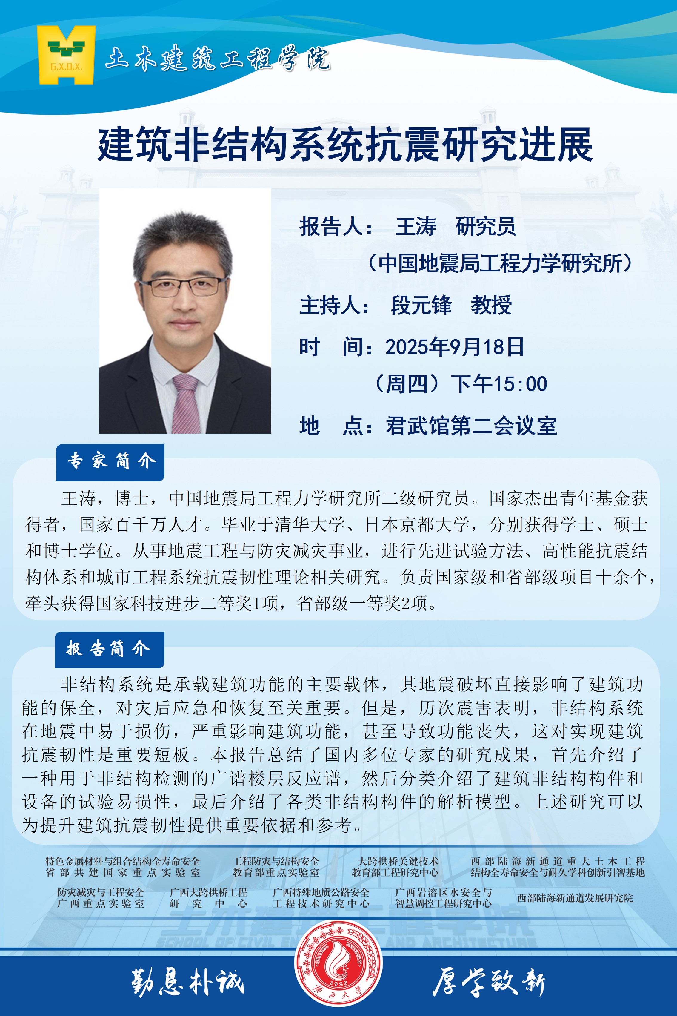 土木建筑工程学院学术报告:建筑非结构系统抗震研究进展