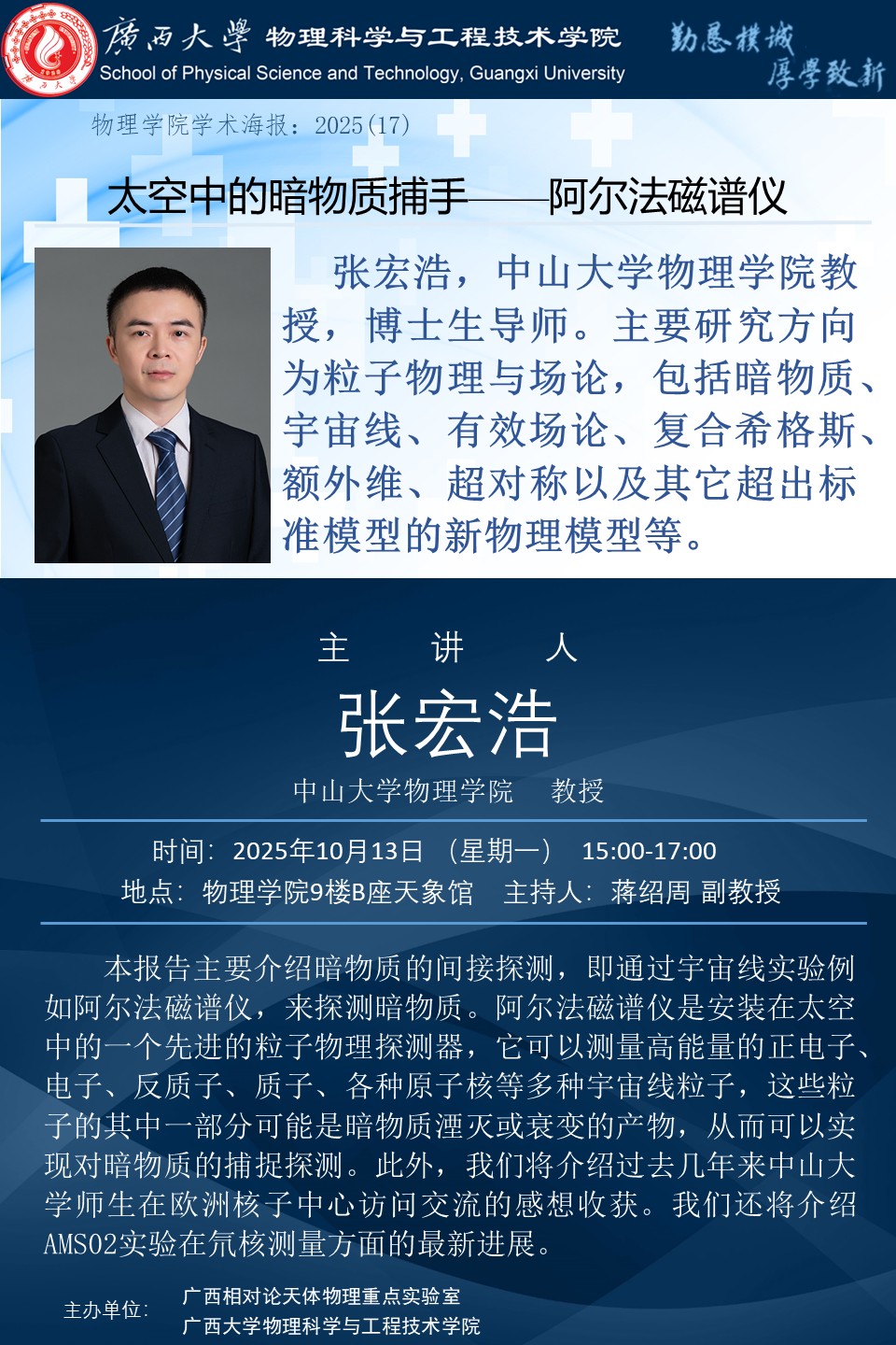 物理科学与工程技术学院学术报告:太空中的暗物质捕手阿尔法磁谱仪