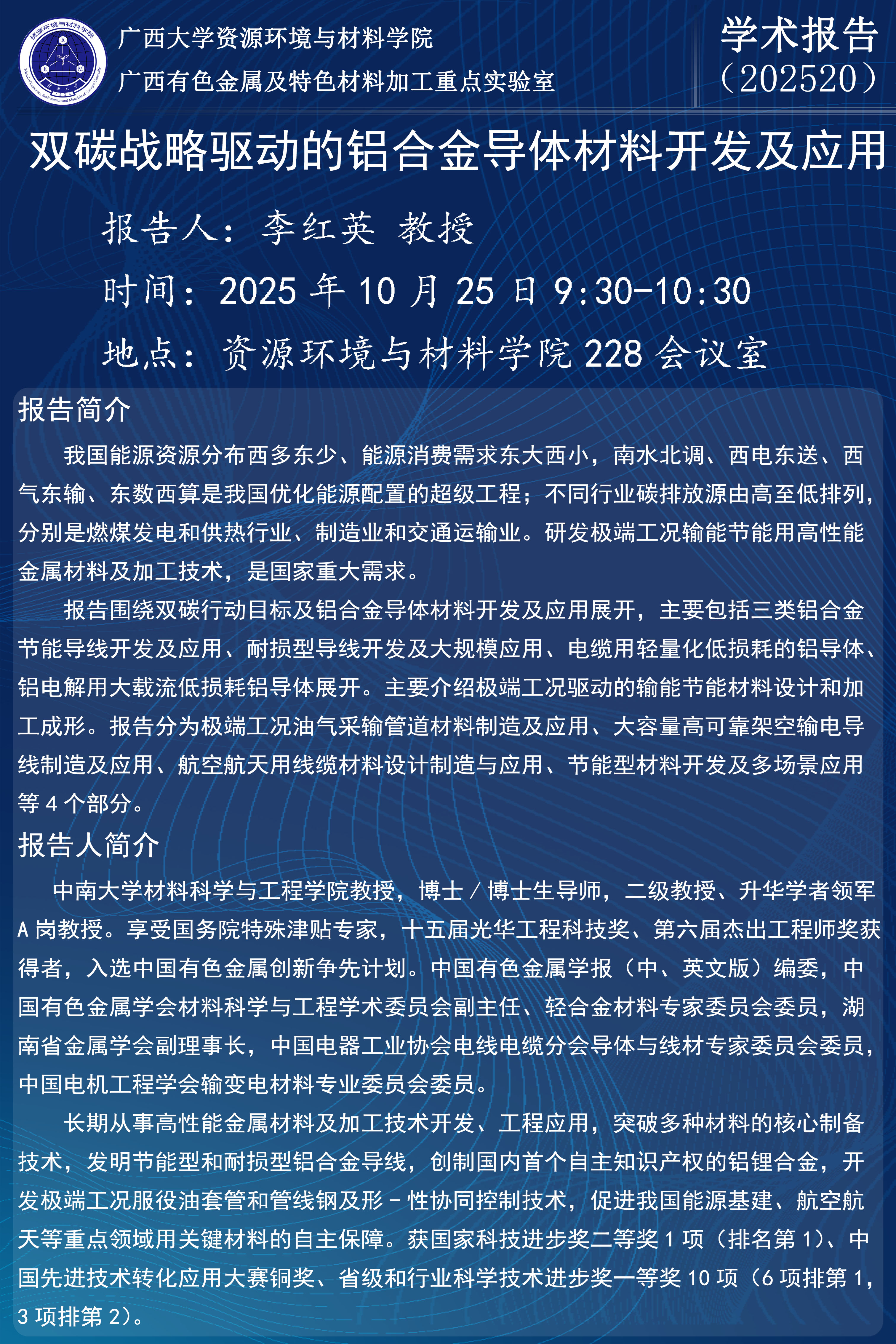 资源环境与材料学院学术报告:双碳战略驱动的铝合金导体材料开发及应用