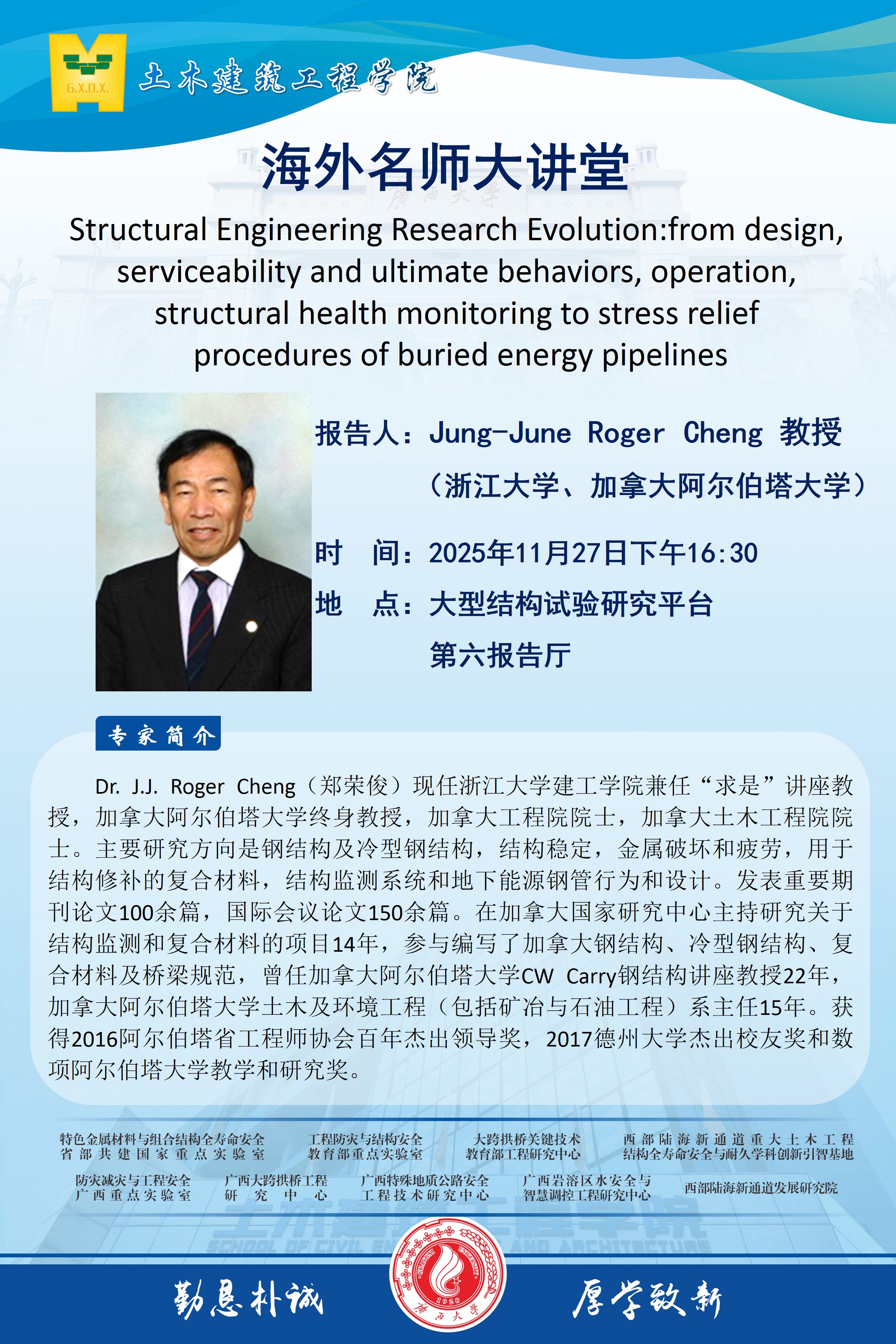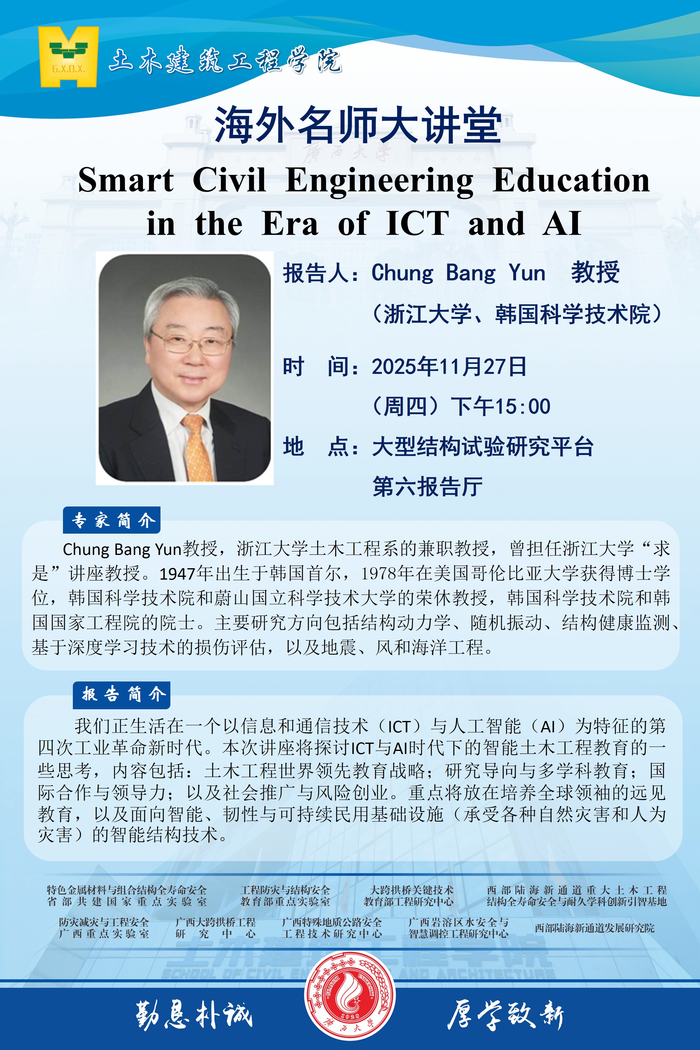 海外名师大讲堂、土木建筑工程学院学术报告:1.Smart Civil Engineering Education in the Era of ICT and AI;2.Structural Engineering Research Evolution: from design, serviceability and ultimate behaviors, operation, structural health monitoring to stress relief procedures of burie