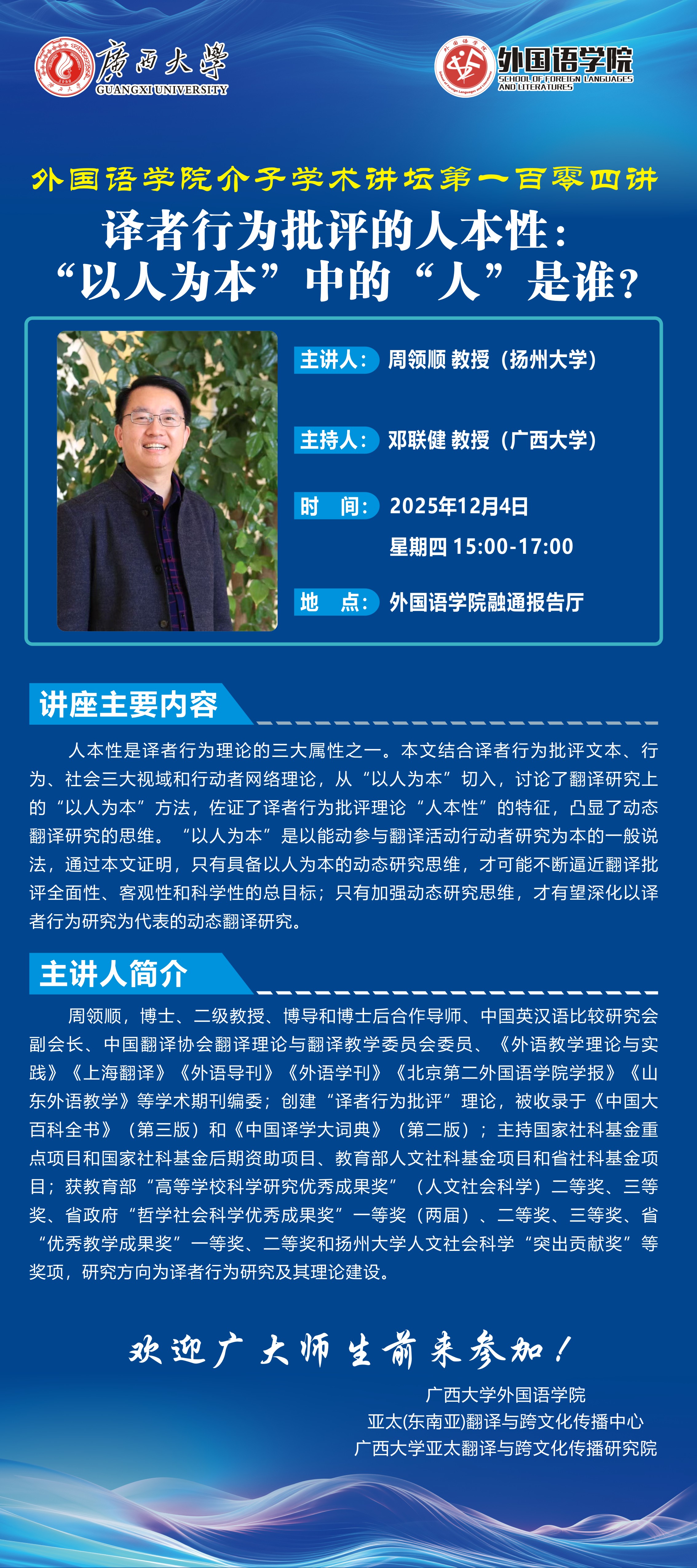 外国语学院学术报告:译者行为批评的人本性:“以人为本”中的“人”是谁?