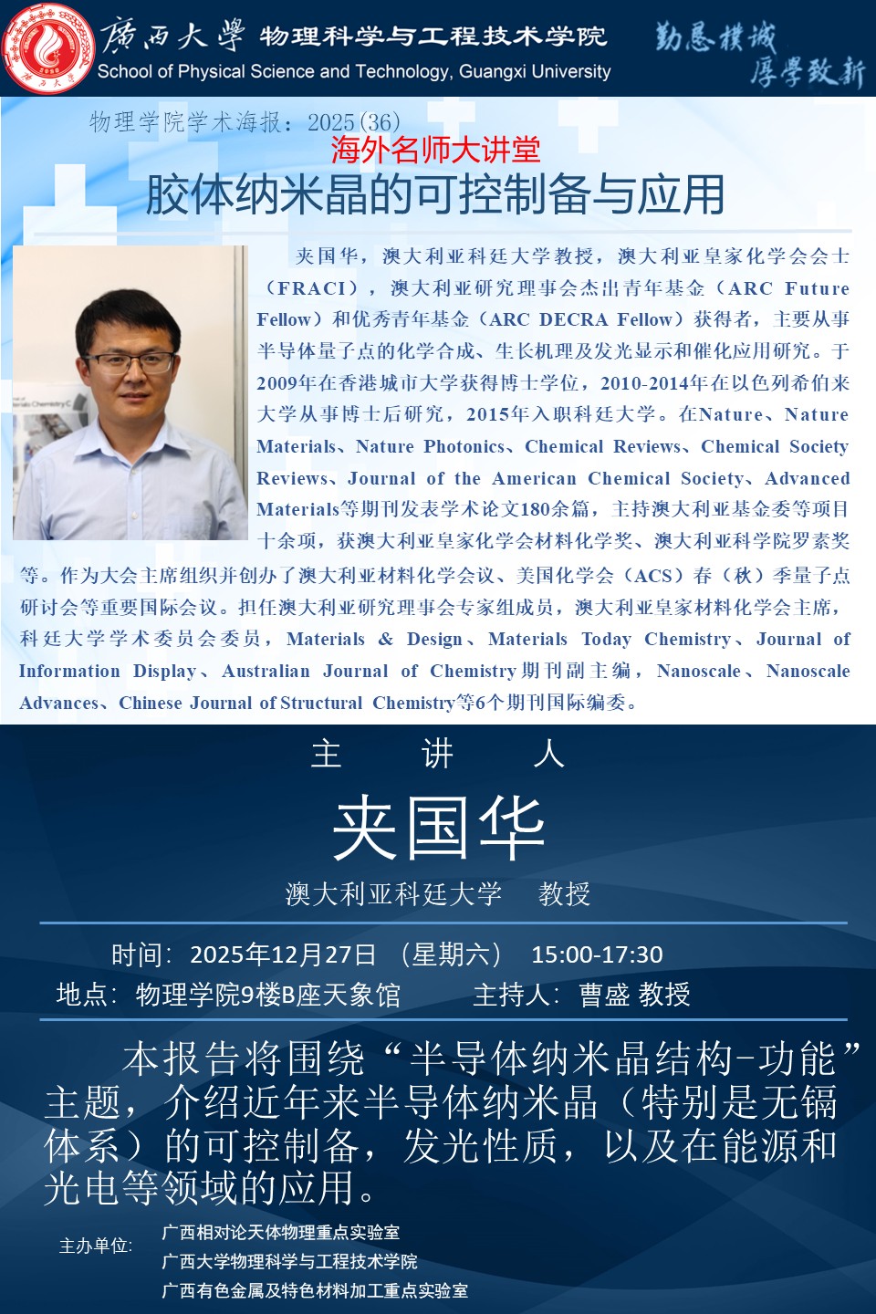 海外名师大讲堂、物理科学与工程技术学院学术报告:胶体纳米晶的可控制备与应用