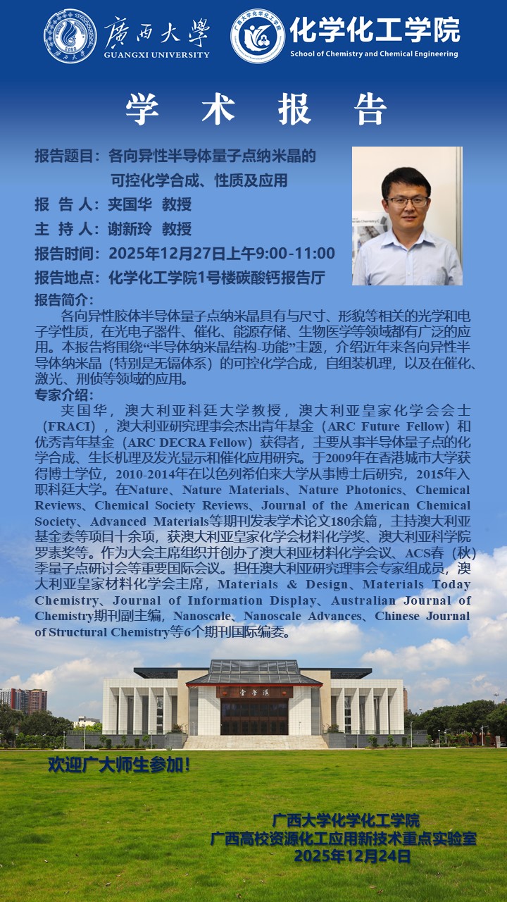 海外名师大讲堂、物理科学与工程技术学院学术报告:胶体纳米晶的可控制备与应用