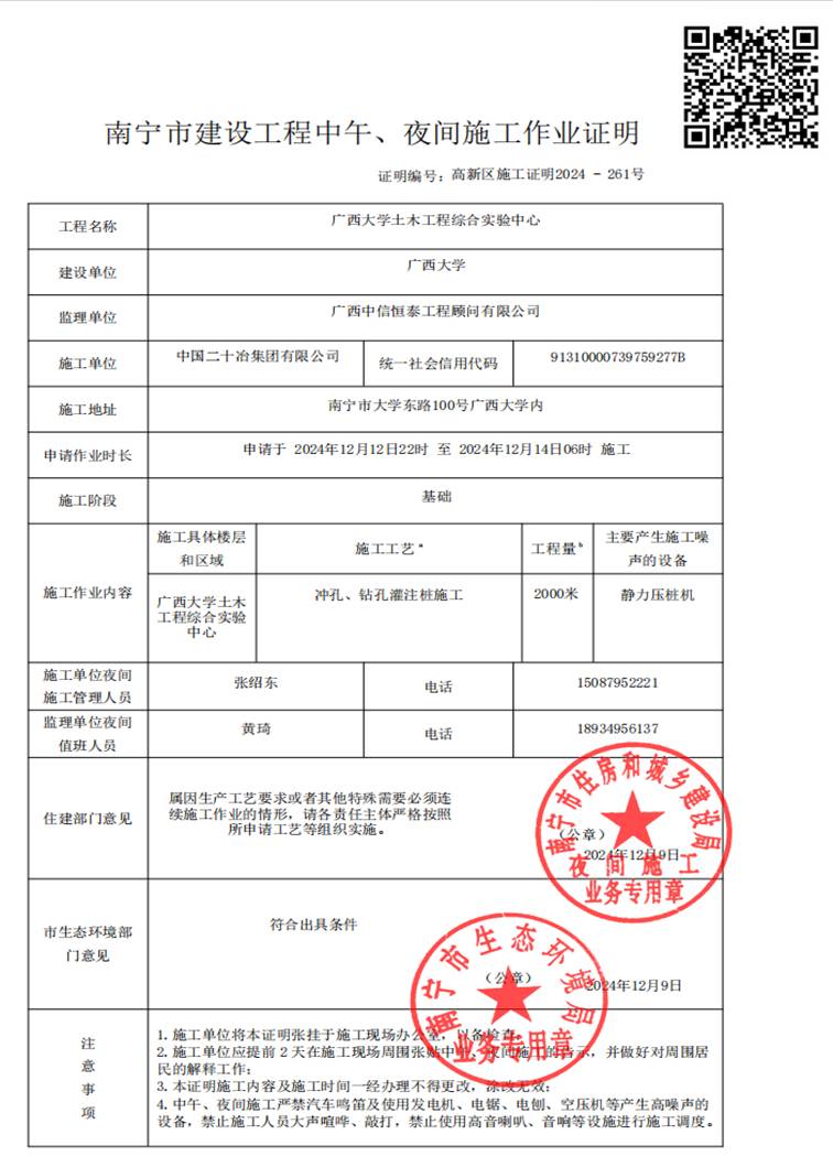 我单位承建的best365足球官网土木工程综合实验中心项目因施工工艺需要,在符合法律许可的夜间施工条件之下,经南宁市住房和城乡建设局、南宁市生态环境局核准,计划于2024年12月12日22:00—2024年12月14日6:00进行静压桩施工。我单位将严格按照建设局、环保局要求,采取有效措施尽可能减少影响。施工期间可能会对广大师生员工的日常生活造成一定的干扰。对此,我们深表歉意,敬请谅解。